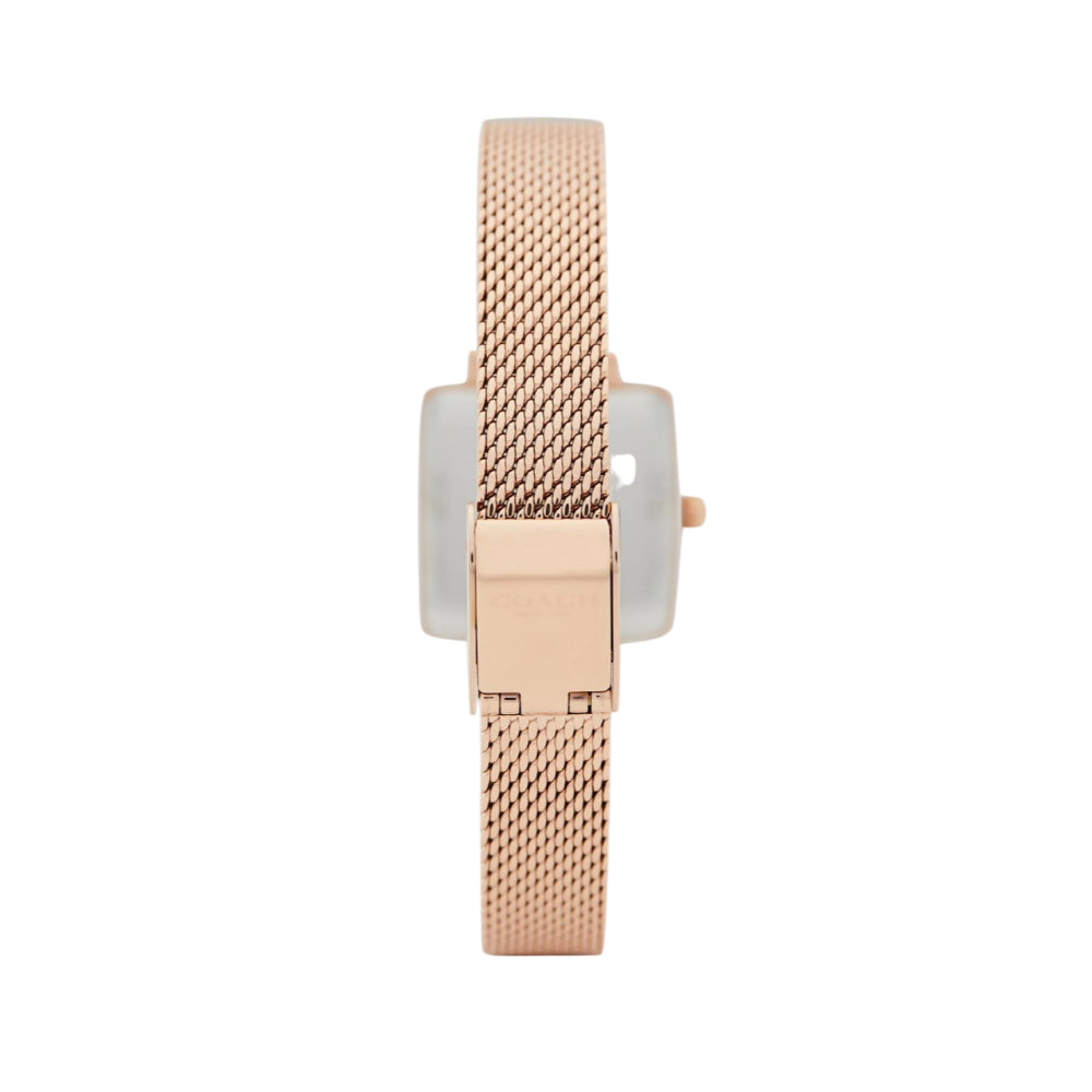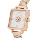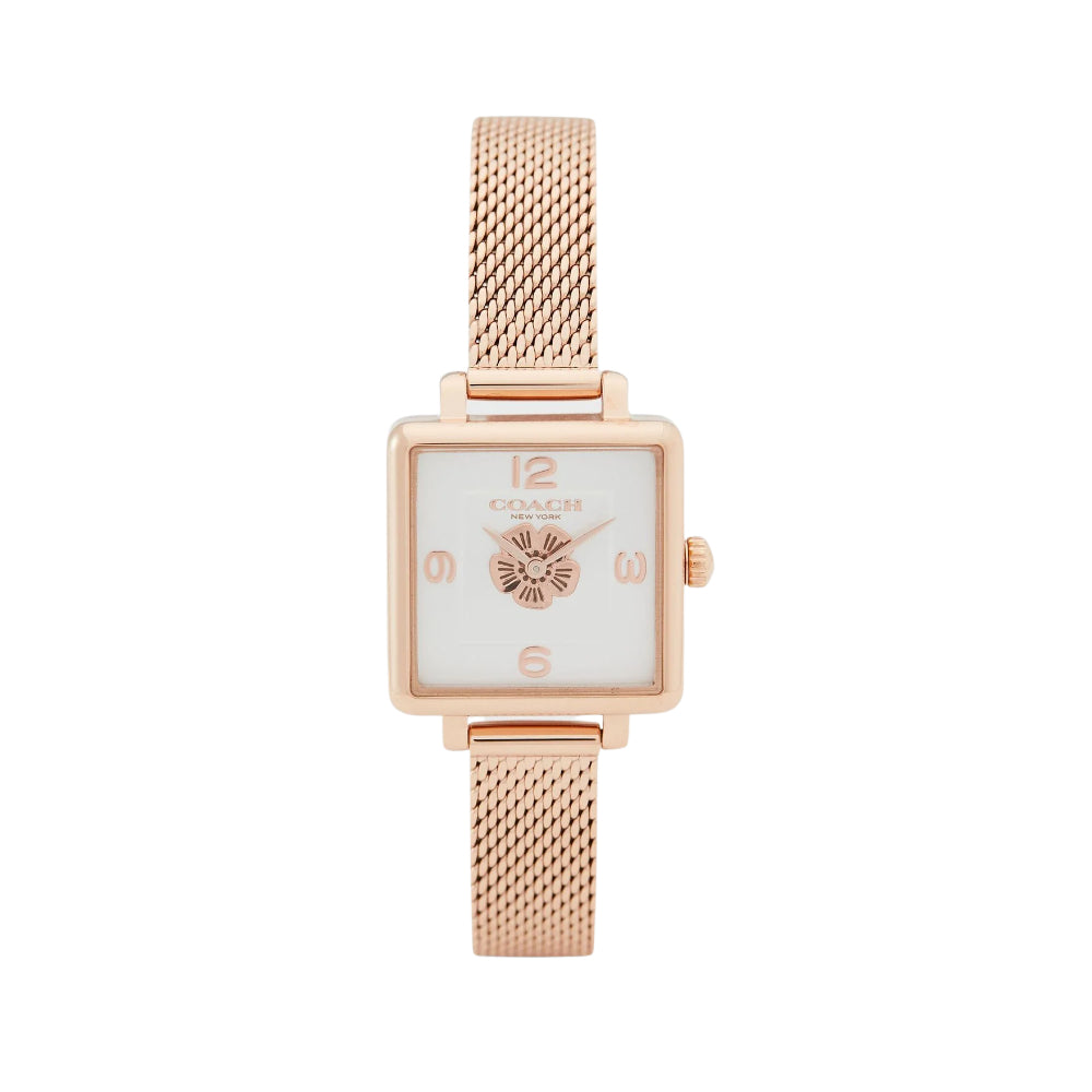 A bold square shape gives the Cass watch modern, distinctive style. Finished with a sleek mesh bracelet, this rose gold design features a dimensional prairie-inspired Coach Tea Rose motif on the dial.