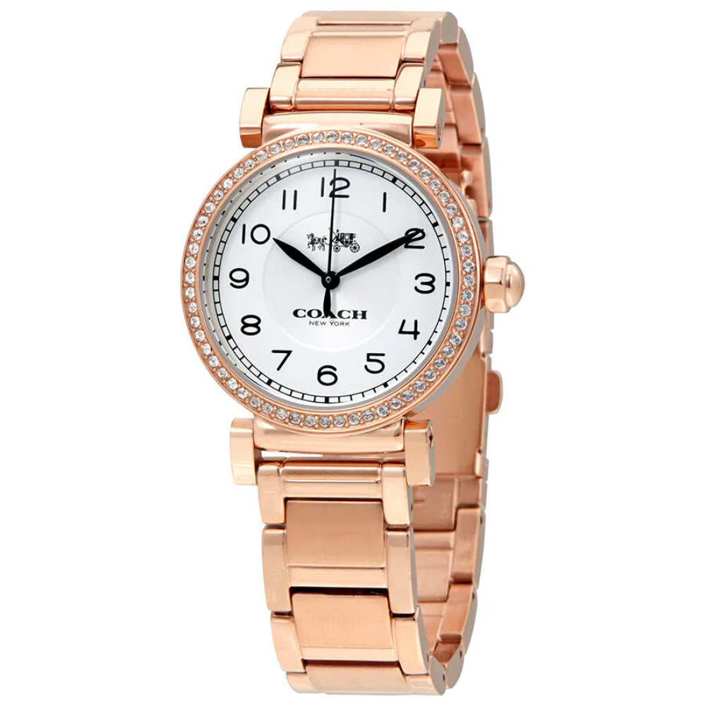 Rose gold-tone stainless steel case with a rose gold-tone stainless steel bracelet. Fixed, crystal set rose gold-tone stainless steel bezel. Silver dial with black hands and Arabic numeral hour markers. Dial Type: Analog. Quartz movement. Scratch resistant mineral crystal. Pull / push crown. Solid case back. Case size: 32 mm. Round case shape. Water resistant at 30 meters / 100 feet. Functions: hour, minute, second. Dress watch style. Coach Madison Ladies Rose Gold-tone Watch 14502398P.