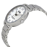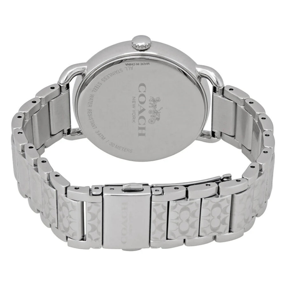 Stainless steel case with a stainless steel bracelet. Fixed stainless steel bezel. Silver dial with luminous silver-tone hands and Arabic numeral hour markers. Minute markers around the outer rim. Dial Type: Analog. Luminescent hands and markers. Quartz movement. Scratch resistant mineral crystal. Pull / push crown. Solid case back. Round case shape. Case size: 36 mm. Case thickness: 9 mm. Band width: 16 mm. Fold over clasp with a push button release. Water resistant at 30 meters / 100 feet. Functions: hour, minute, second. Dress watch style. Coach Delancey Silver Dial Stainless Steel Ladies Watch 14502495P.