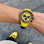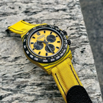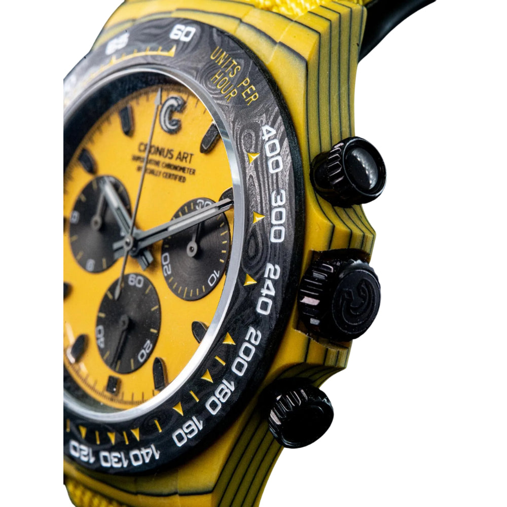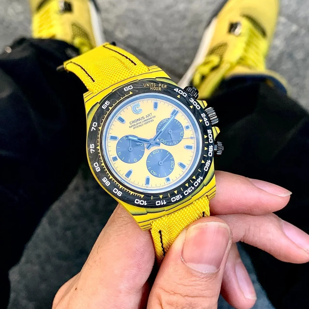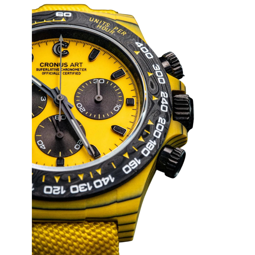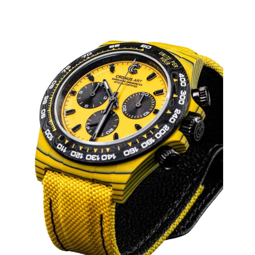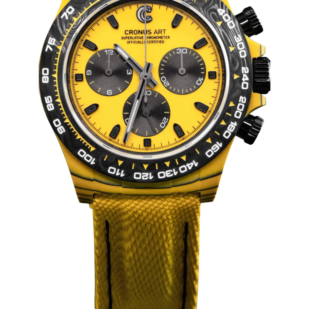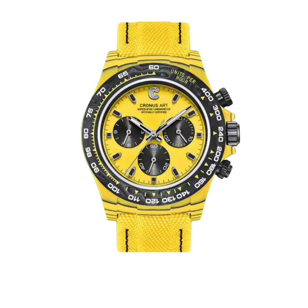 The Cosmic Daytona Series is a specially designed style combining together with the prototype of Rolex Daytona and with many different world ideas. It is an odometer version ideal for calculating up to 400 speed units per hour. The concept is designed to be stylish and combining of all the finishing on the design of a high-grade Carbon Fiber frame that is lightweight, comfortable, and extremely durable. Smooth texture with premium leather-trimmed canvas watch band at the clasp. All of which not only make it more comfortable to wear, but also enhance the shape with perfect function. Cronus Art has added free style, vitality and changed the Daytona feel to a brand new world on your wrist.