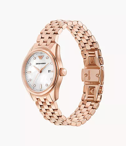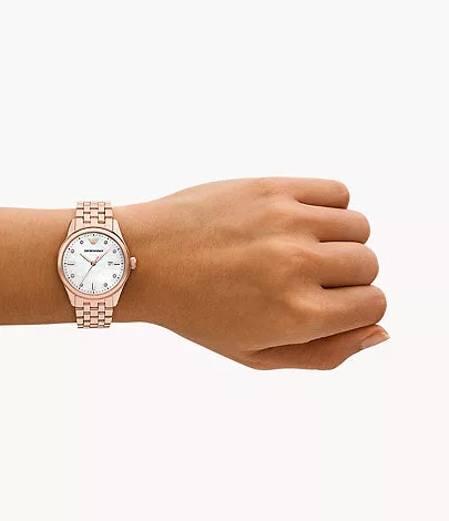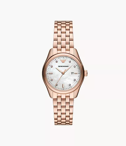 The Emporio Armani AR11615 is a luxurious and feminine timepiece designed to elevate your elegance. With a 32mm rose gold-tone stainless steel case and a white mother-of-pearl dial, this watch is a perfect blend of sophistication and modern charm.