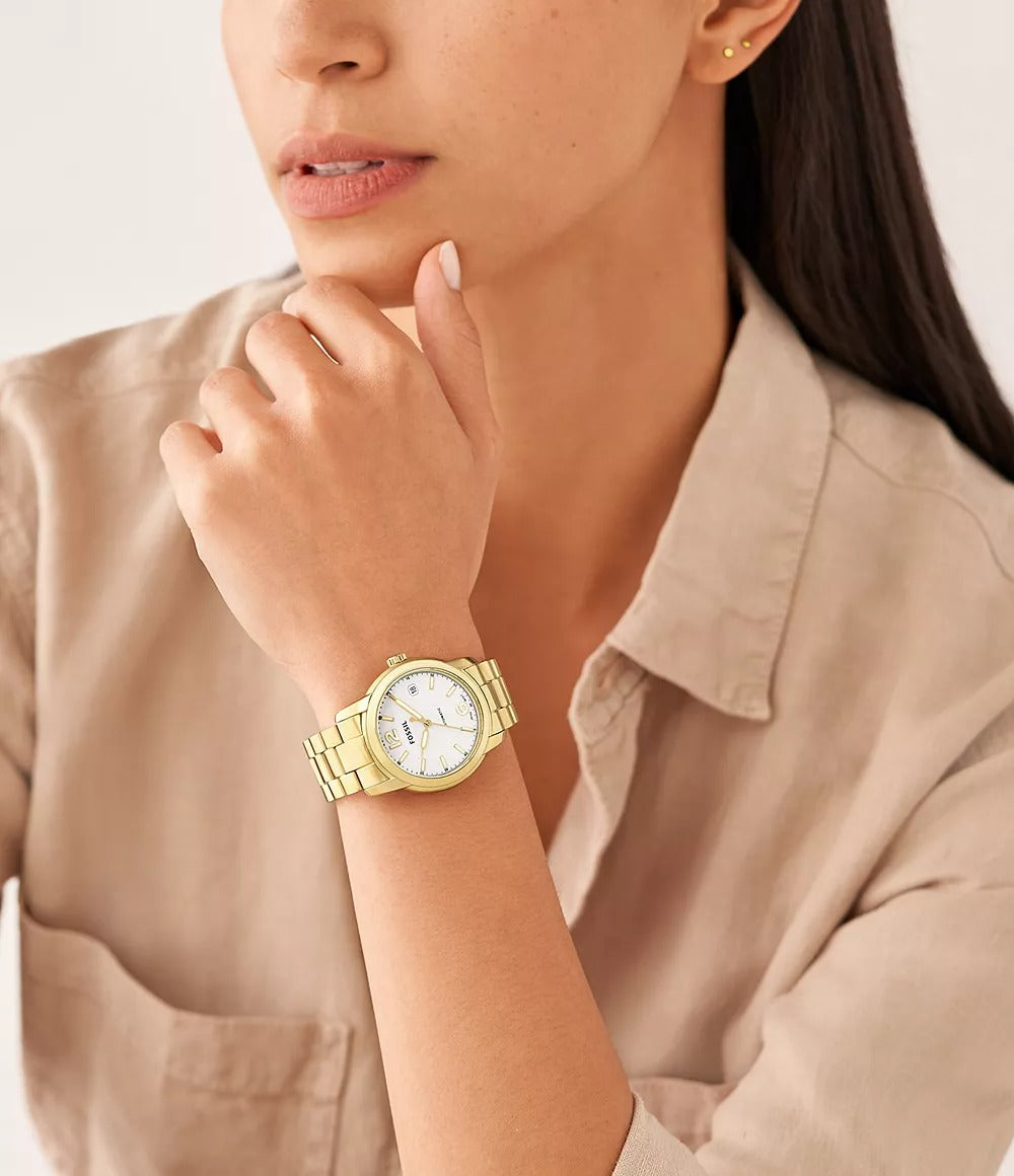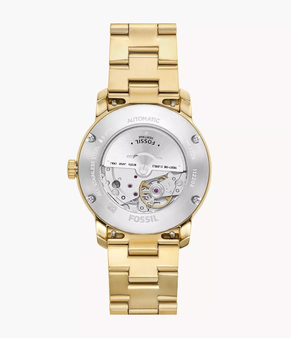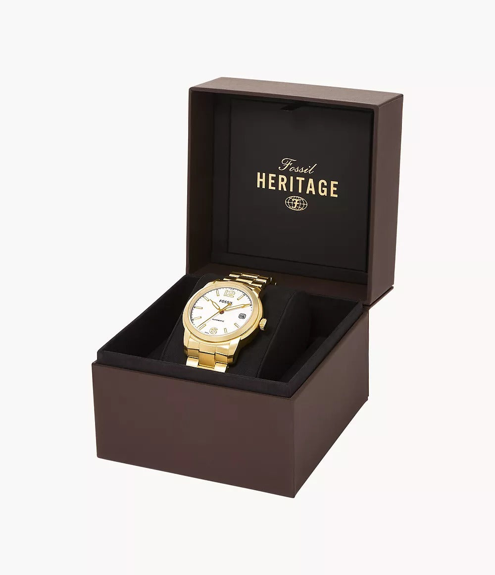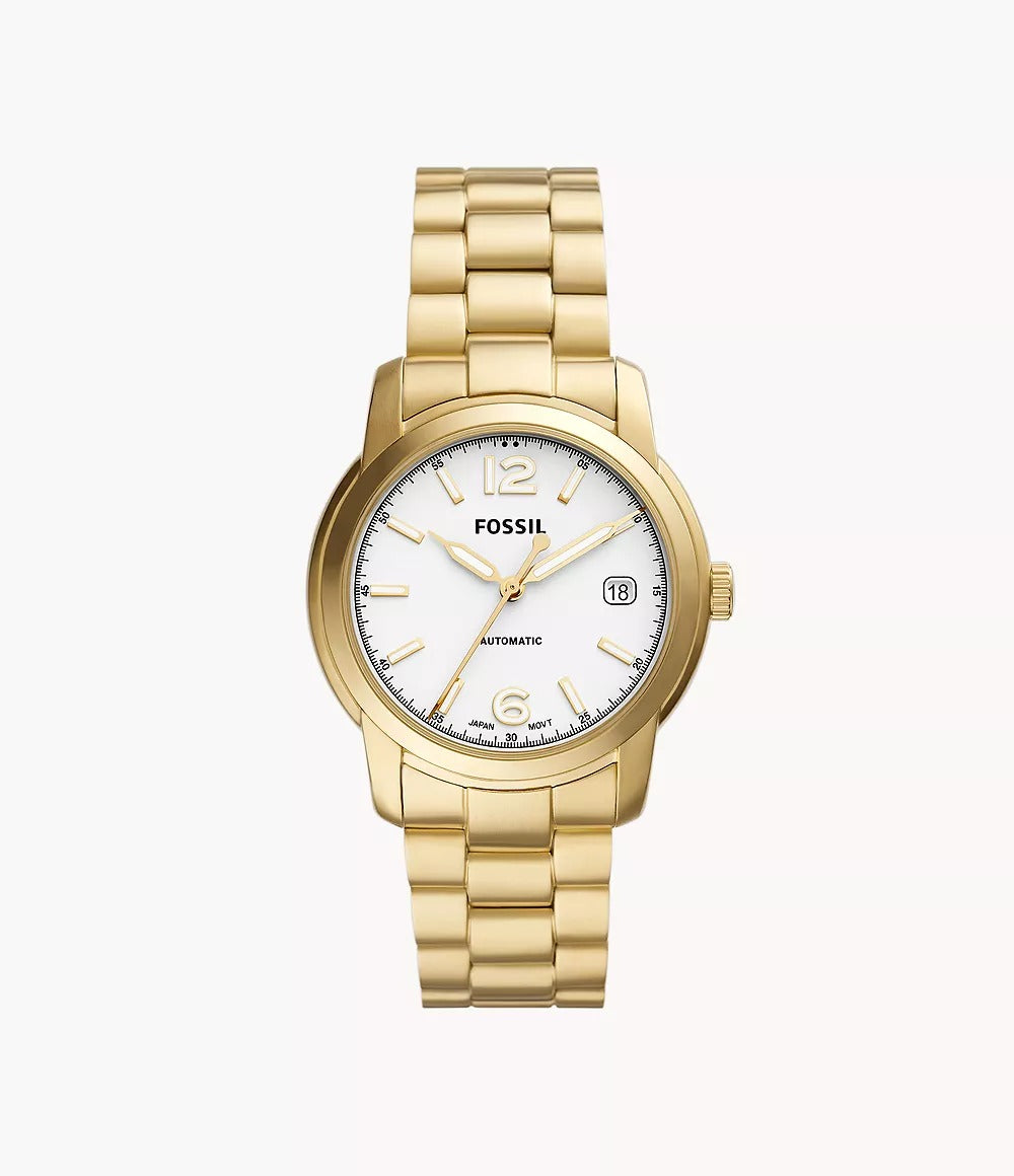The Fossil ME3226 Heritage Automatic Watch combines timeless elegance with precise functionality. This 38mm watch features a white matte dial, an automatic movement, and a gold-tone stainless steel bracelet, offering a sophisticated look for everyday wear.