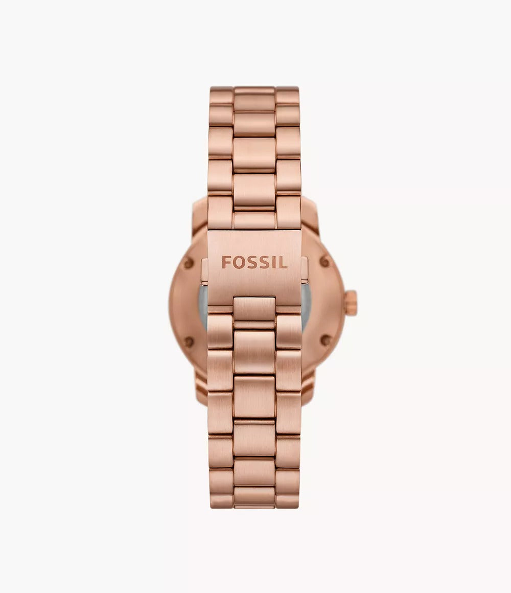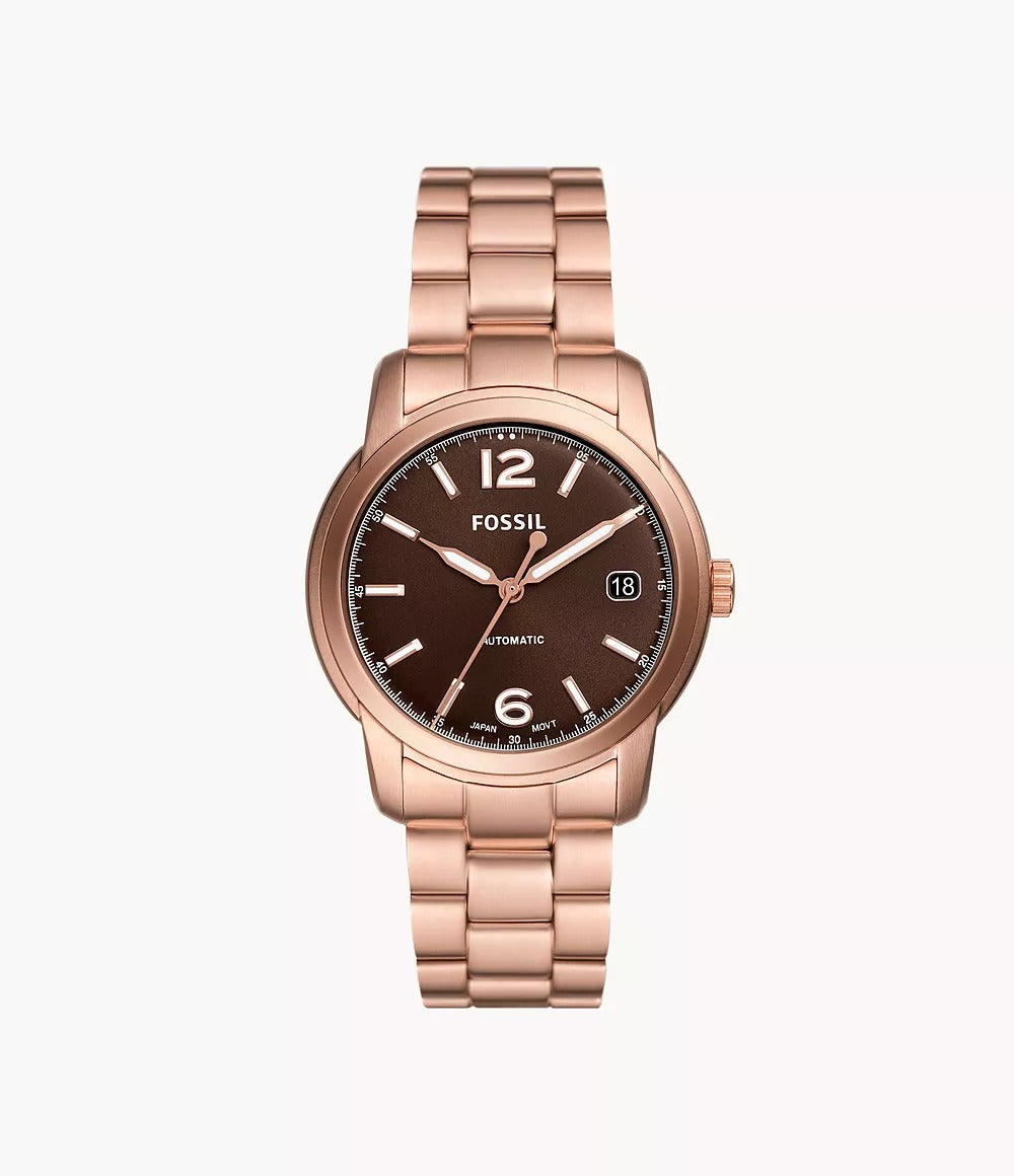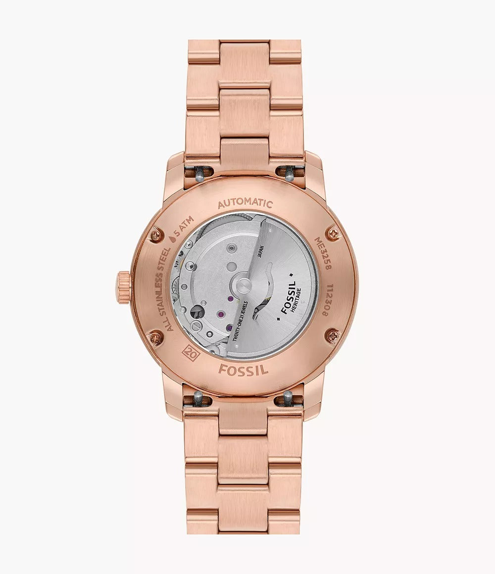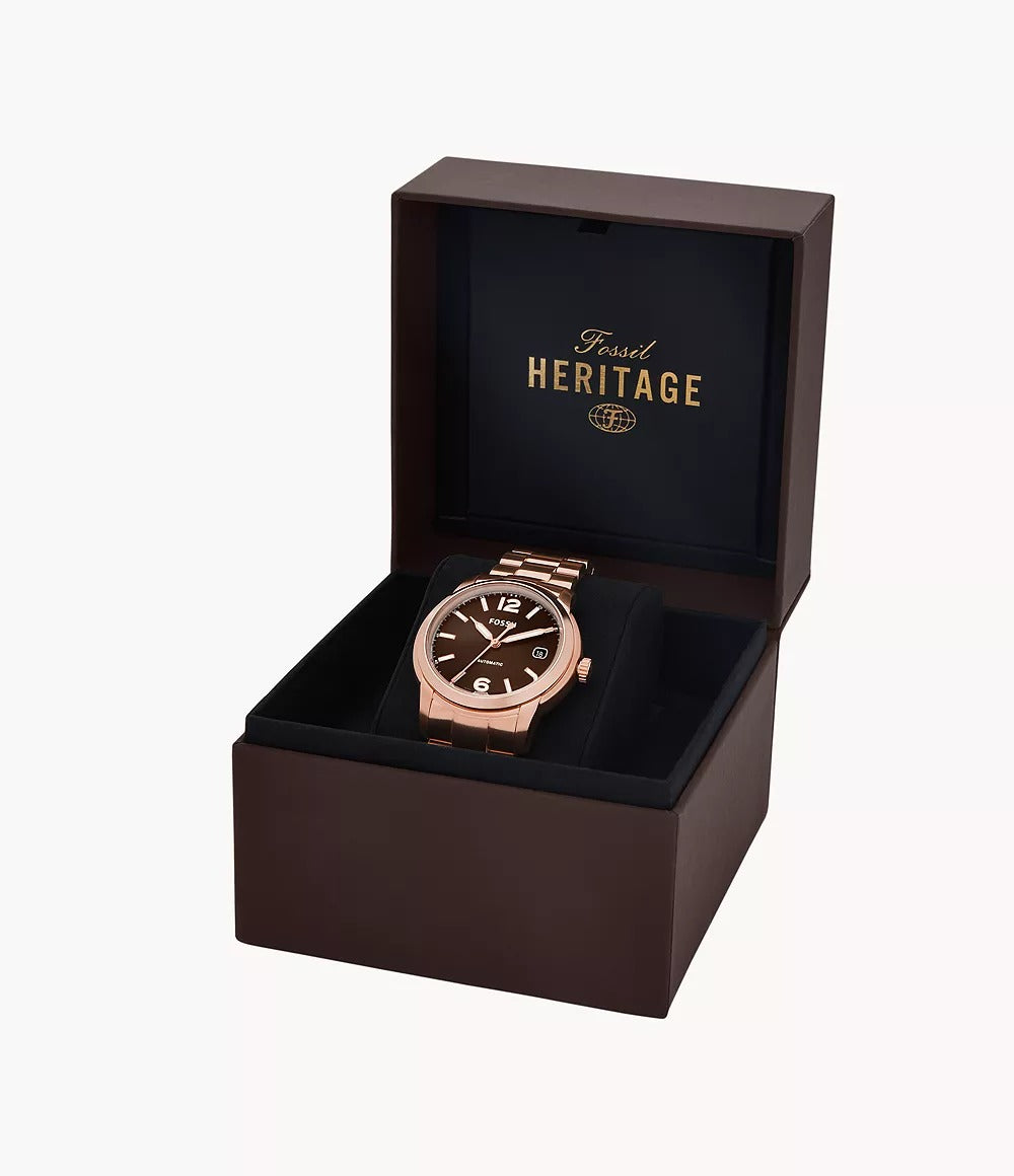 The Fossil ME3258 Heritage Automatic Watch is a perfect blend of timeless craftsmanship and contemporary style. Featuring a 38mm case, brown sunray dial, precision Japanese automatic movement, and a rose gold-tone stainless steel bracelet, this piece exudes elegance and sophistication.