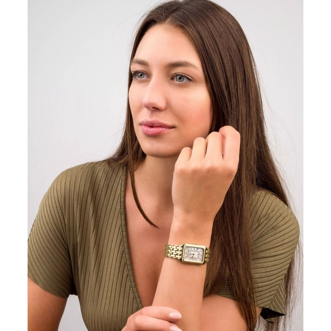 The Fossil Raquel ES5304 is a stylish and elegant women's watch. The mother-of-pearl-filled dial, decorated with crystals, is complemented by a day-of-the-month date display. The Japanese quartz movement Citizen Miyota GL12 is responsible for precise timekeeping. The water resistance is 5 ATM.