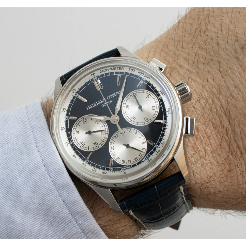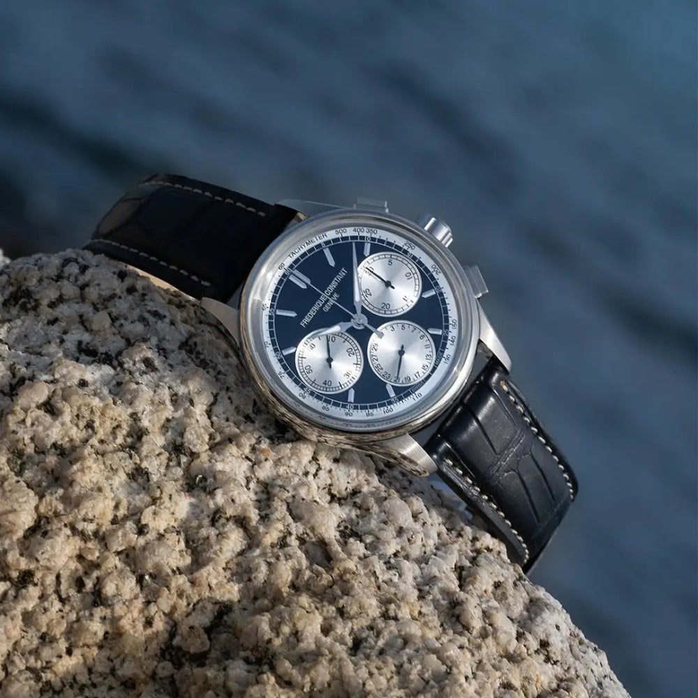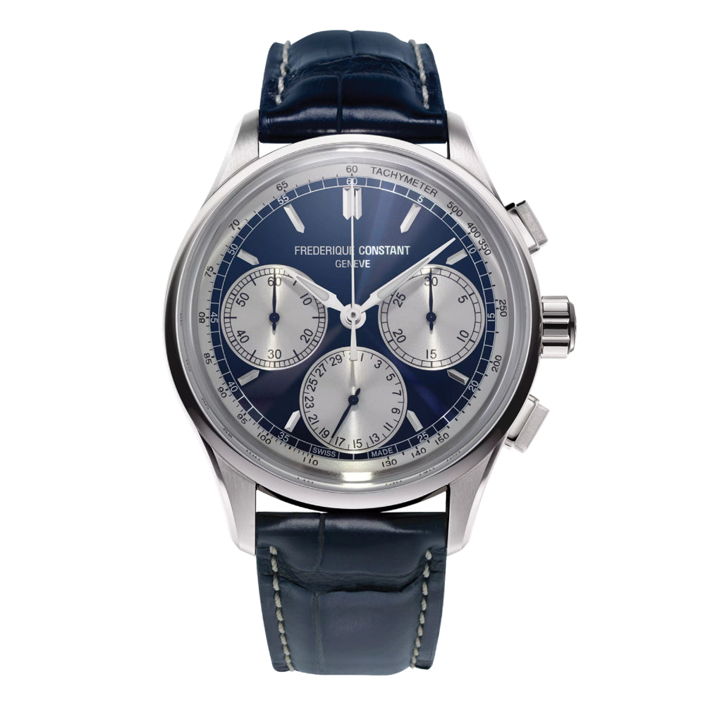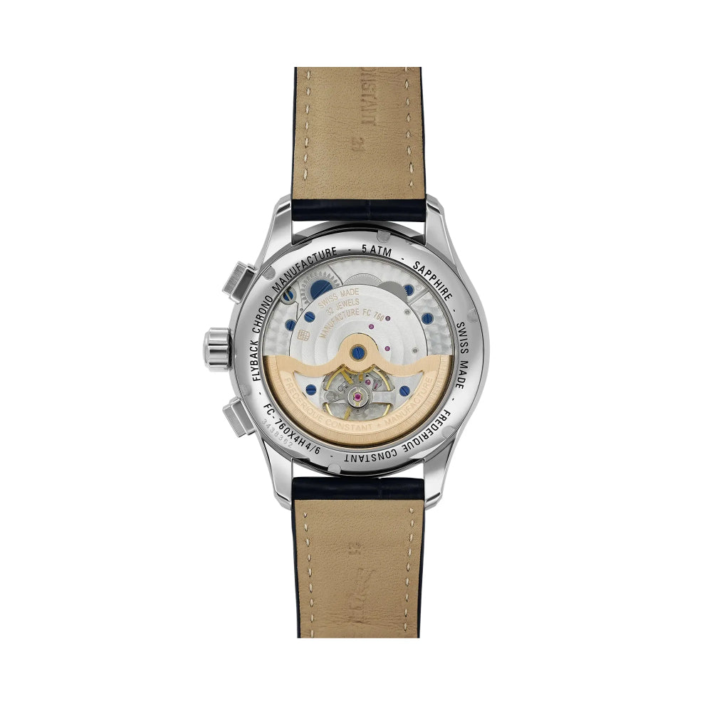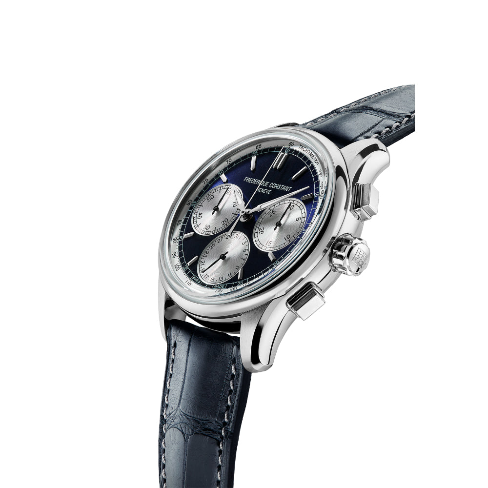Our Classic Flyback Chronograph Manufacture watches are equipped with the FC-760 Manufacture caliber which means that this caliber is in-house designed, produced, and assembled. Inspired by 1930’s flyback chronographs and driven by a desire to go beyond a regular chronograph construction, its chronograph can be stopped, reset to zero, and restarted with one push of a button. This function is essential for timing an elapsed interval of events during races.