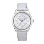 Quartz women's watch of Eva collection with MVT. Y121E1 movement and only time 3H function. Tha case with stainless steel finishing measures 40,5x38mm, equipped with a mineral crystal. The dial is white silver and the leather strap with pin buckle is white. Water resistant up to 3 atm.