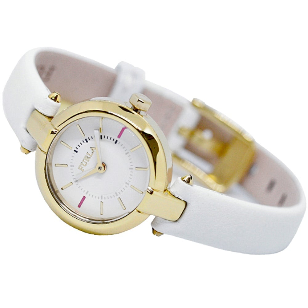 It features a white leather strap, a gold stainless steel case and has a silver dial with two hand movement dial.