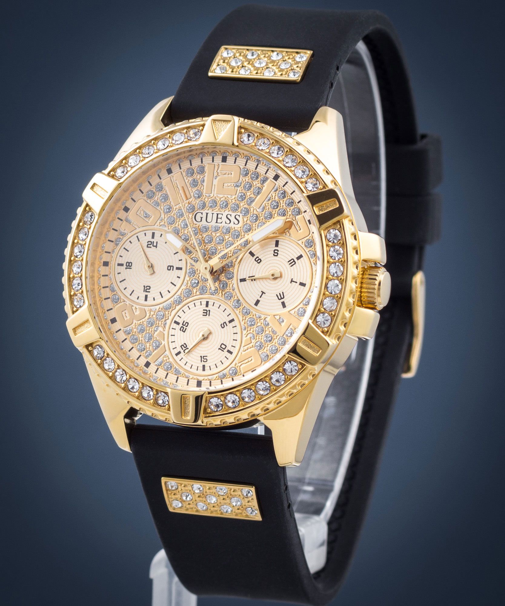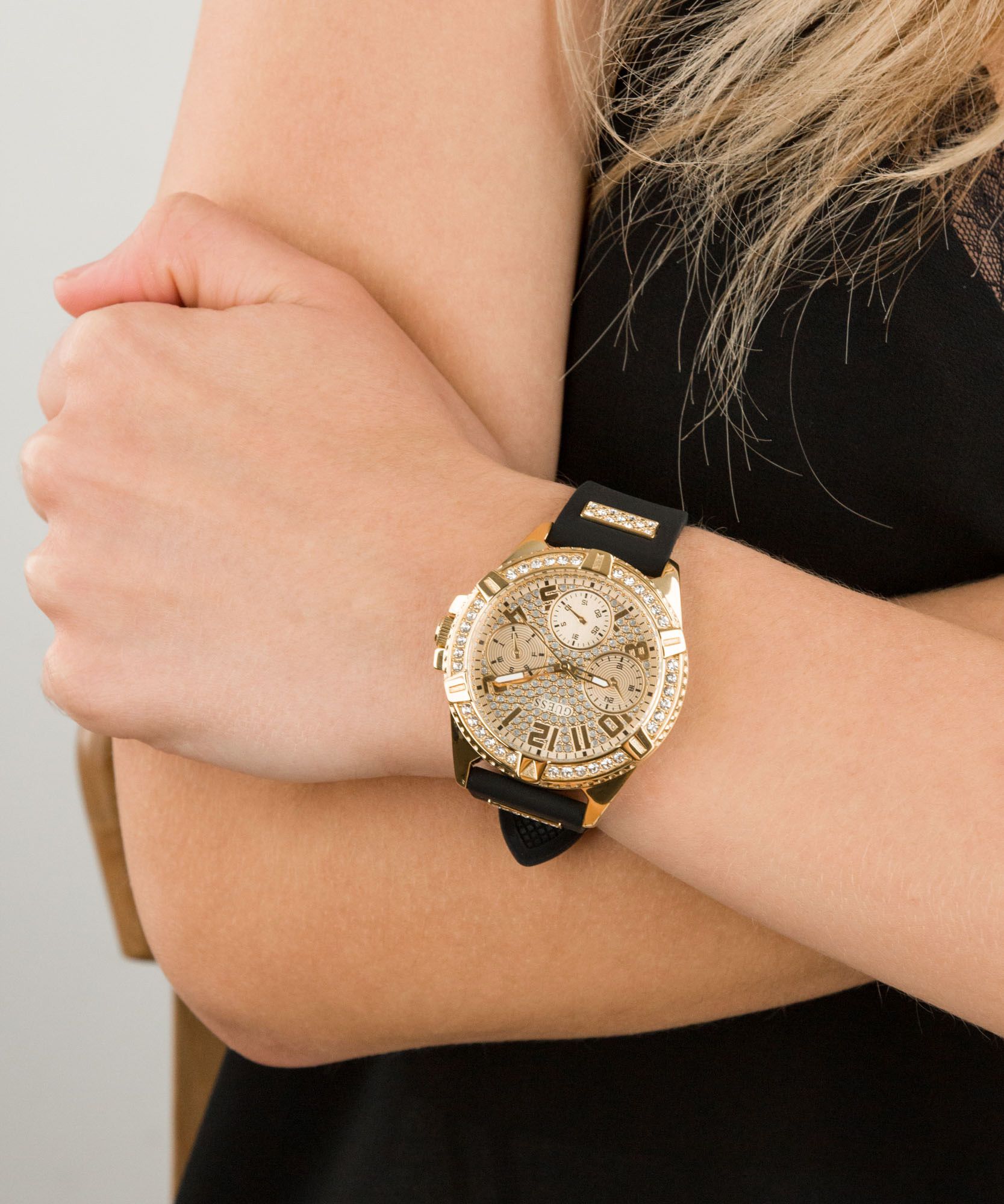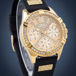 GUESS FRONTIER GLITZ GOLD DIAL BLACK STRAP WATCH W1160L1