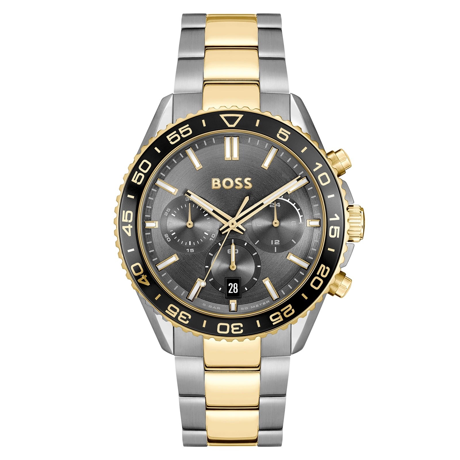 The Hugo Boss Runner 1514144 is a sophisticated men's watch featuring a striking black dial and a two-tone gold stainless steel strap. Perfect for those who appreciate elegance and functionality.