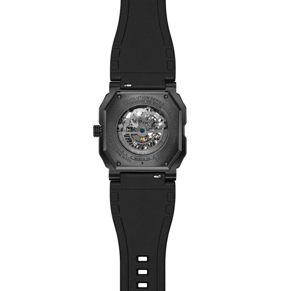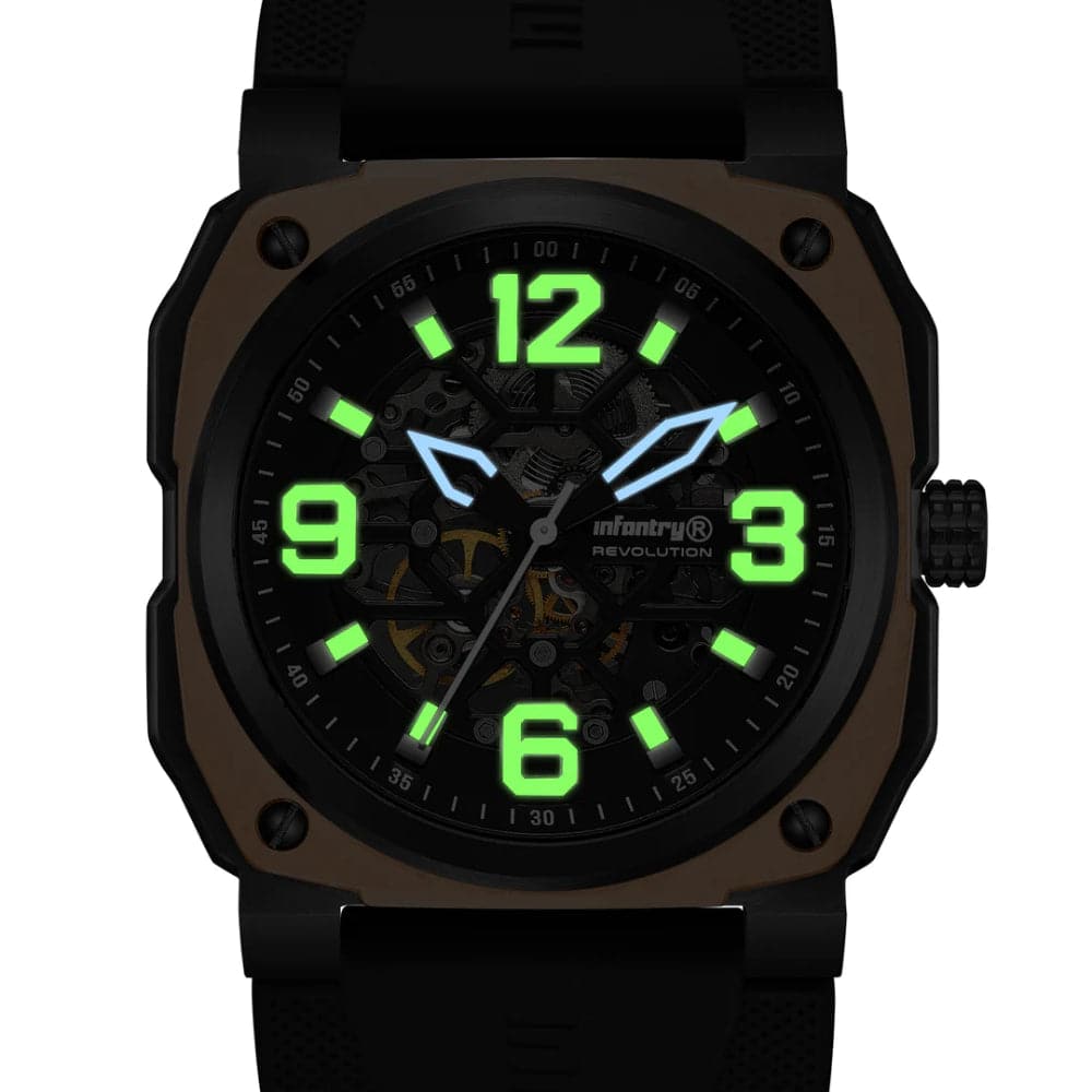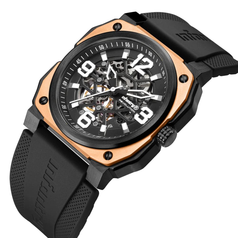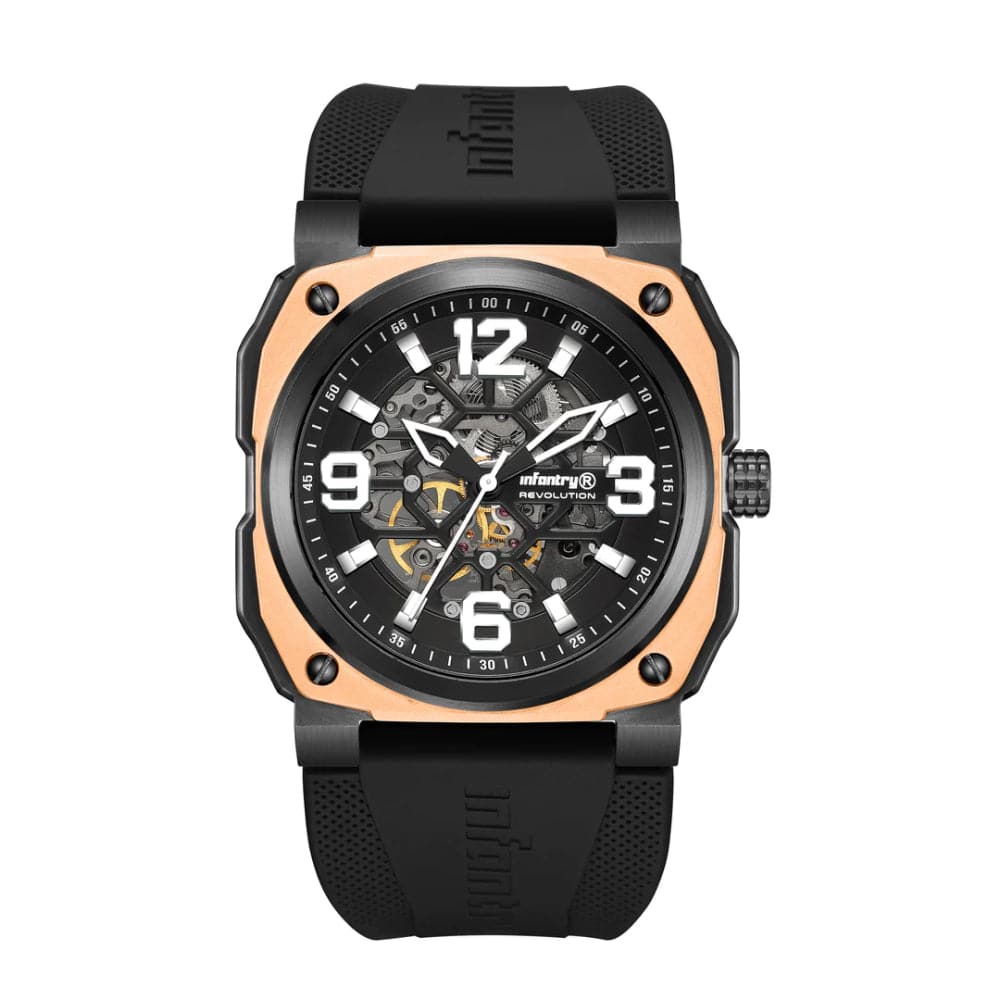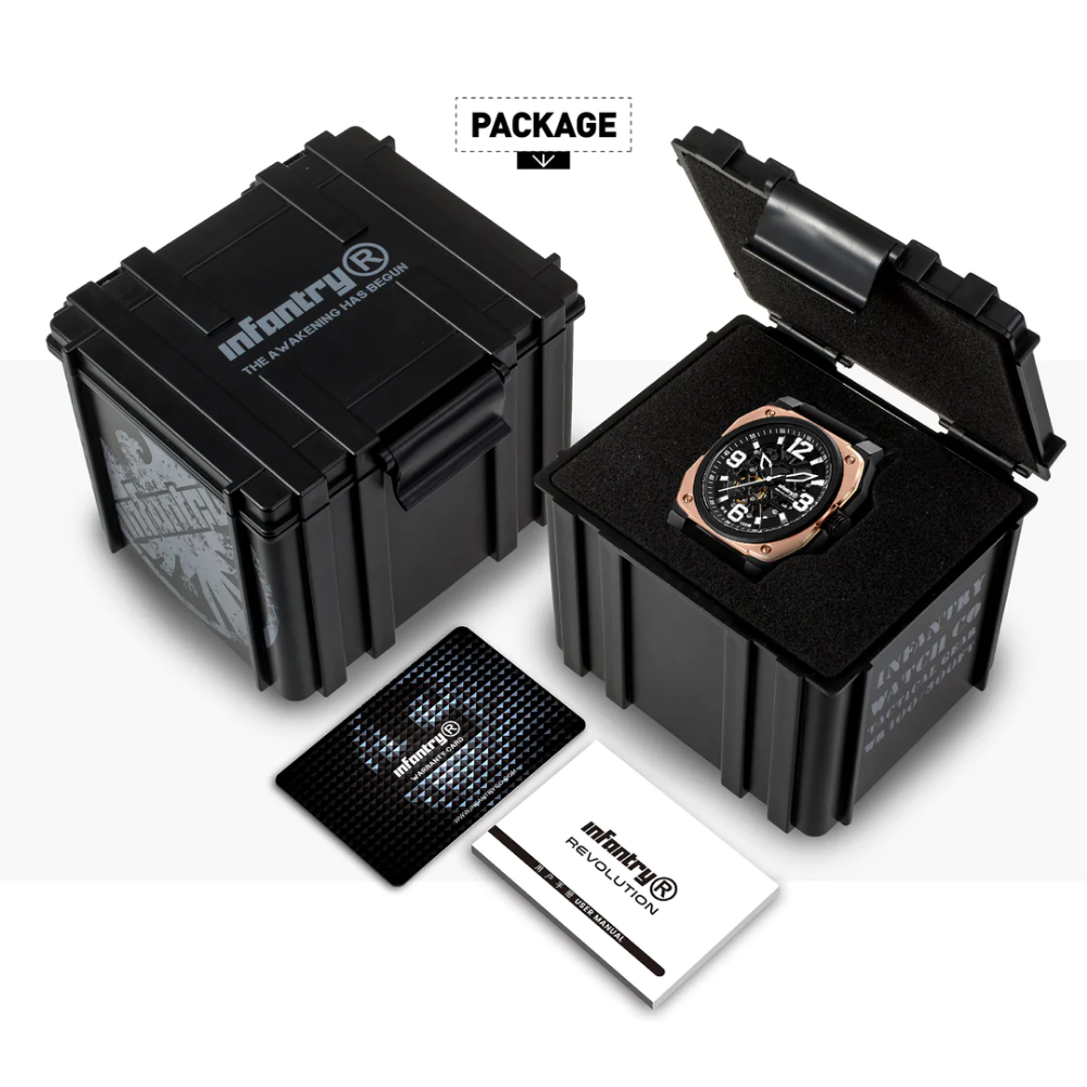 Give your wrist a stunning look with this watch from the Revolution The Skeleton collection by INFANTRY. Housed in a 47 mm case, the dial is shielded with sapphire glass and runs on an automatic movement. It is water resistant up to 100 m and is finished with a buckle to guarantee a snug fit on the wrist.