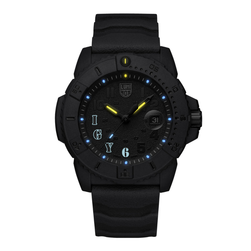 This limited-edition timepiece of the 3600 series is produced in collaboration with the Navy SEAL Foundation and celebrates one of the SEALs key mantras, “I GOT YOUR 6” meaning "I GOT YOUR BACK". In military units worldwide, this mantra embodies camaraderie and unwavering support. The "I G Y 6" inscription on the dial between 6 and 9 o’clock, glows brilliantly in dark or low-light environments when charged, thanks to Super-LumiNova® technology. The ice blue and yellow vertically positioned Luminox Light Technology tubes used at each hour around the dial provide readability in complete darkness. Utilizing Luminox’s trademark carbon fiber based CARBONOX™ material, the robust 45mm case and uni-directional bezel construction protects its intricate Swiss Made quartz movement and provides 200-meter water resistance. Limited to 1006 exclusive pieces worldwide, this watch is a tribute to the Navy SEAL Foundation’s dedication and support for the Naval Special Warfare Community.