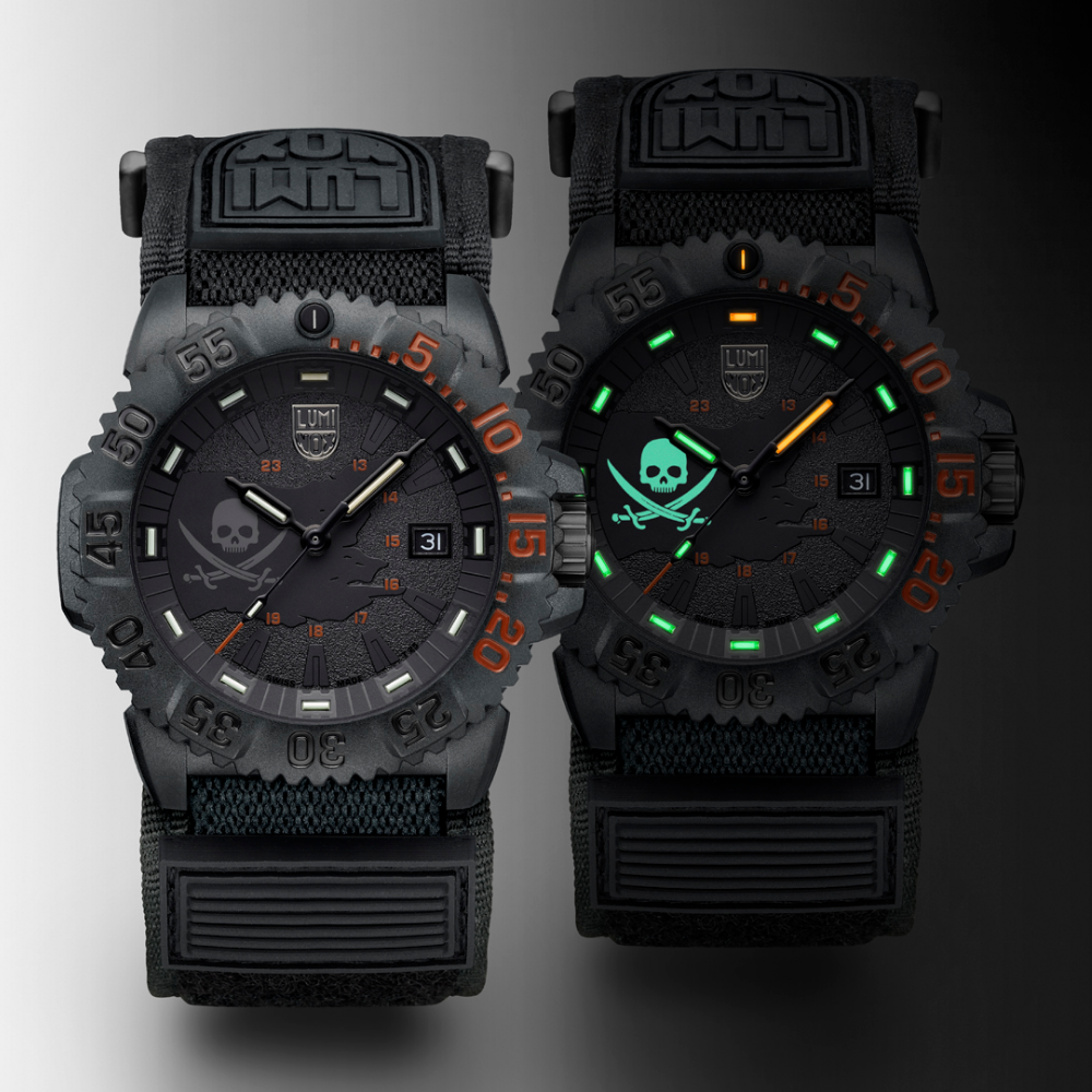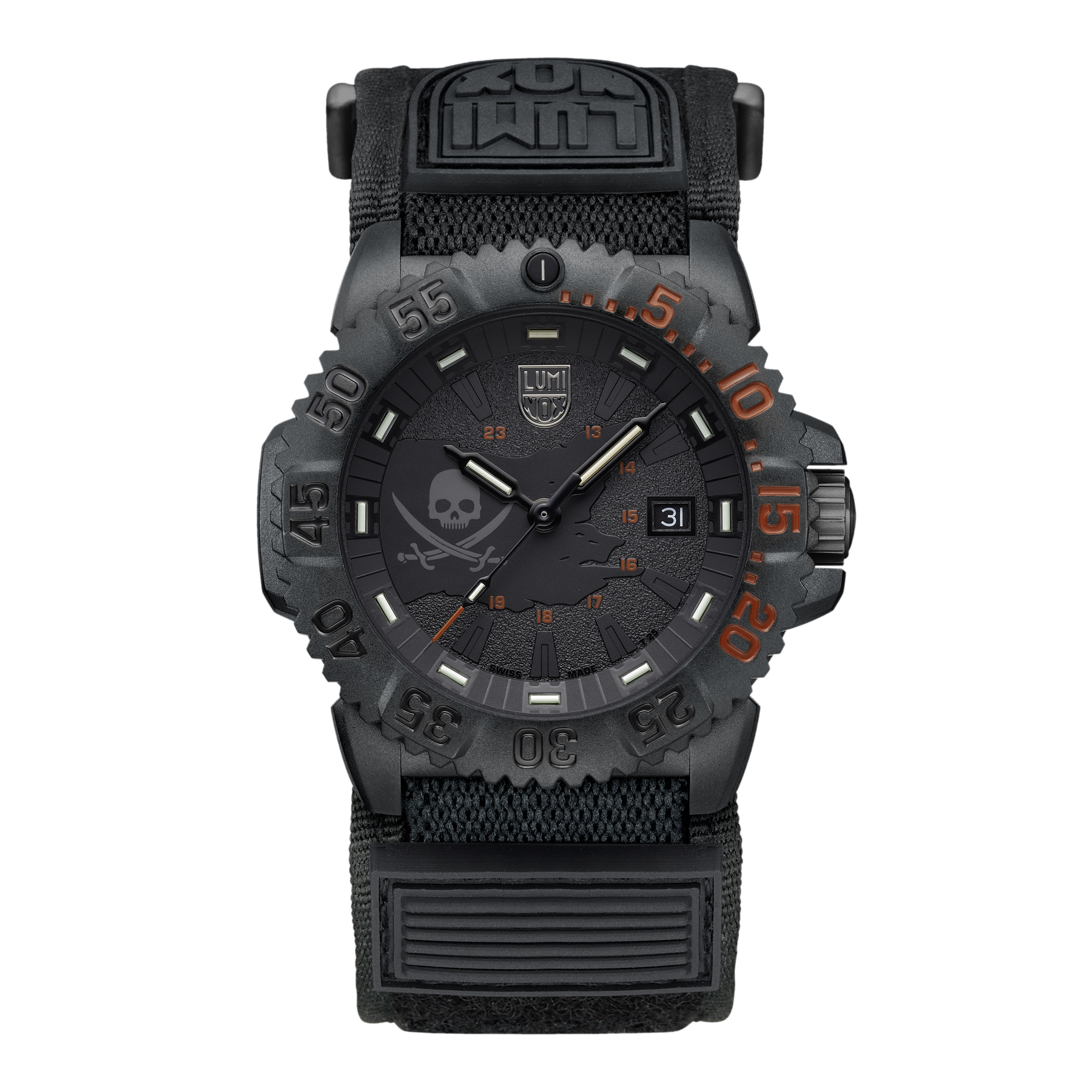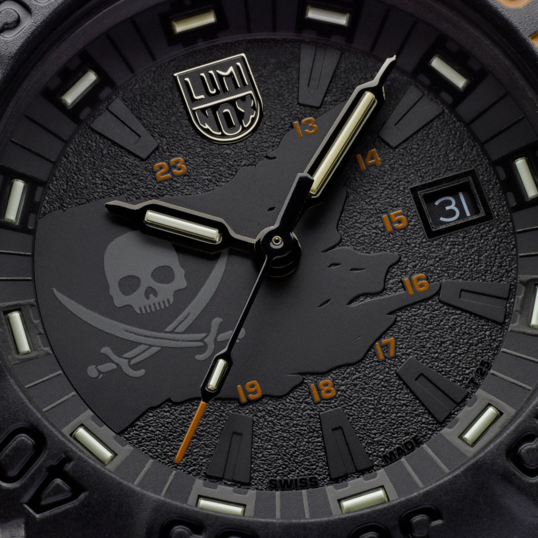 This limited-edition Luminox Pirates LM3051.PIR.LE Watch gives a rebellious twist to an iconic design. Inspired by the Jolly Roger flag, it features a luminous skull at 9 o’clock on a blackout dial — a bold symbol of freedom and fearlessness. Limited to 888 pieces worldwide, it’s built with a 44 mm CARBONOX™ case, unidirectional bezel, and 200-meter water resistance. Powered by Swiss quartz and equipped with Luminox Light Technology, it stays visible for up to 25 years. Complete with a Velcro strap and an additional rubber strap, it’s ready for any terrain. Rugged, reliable, and made for adventure.