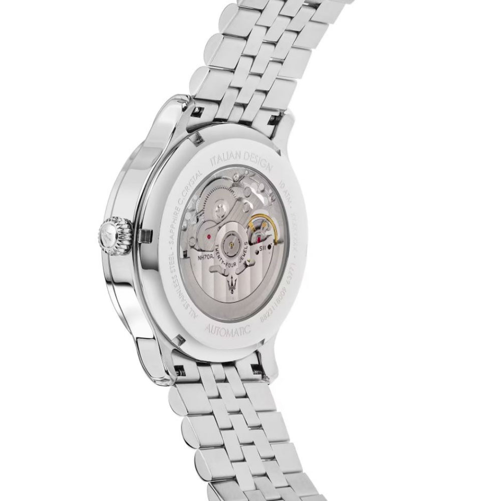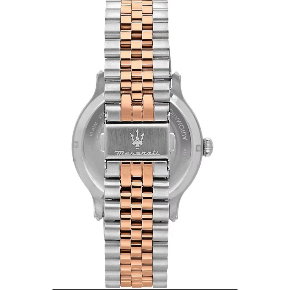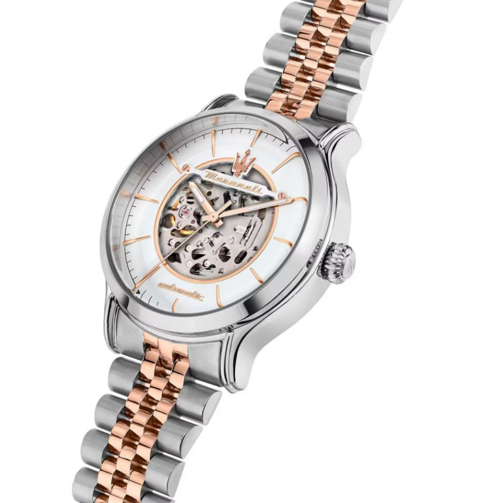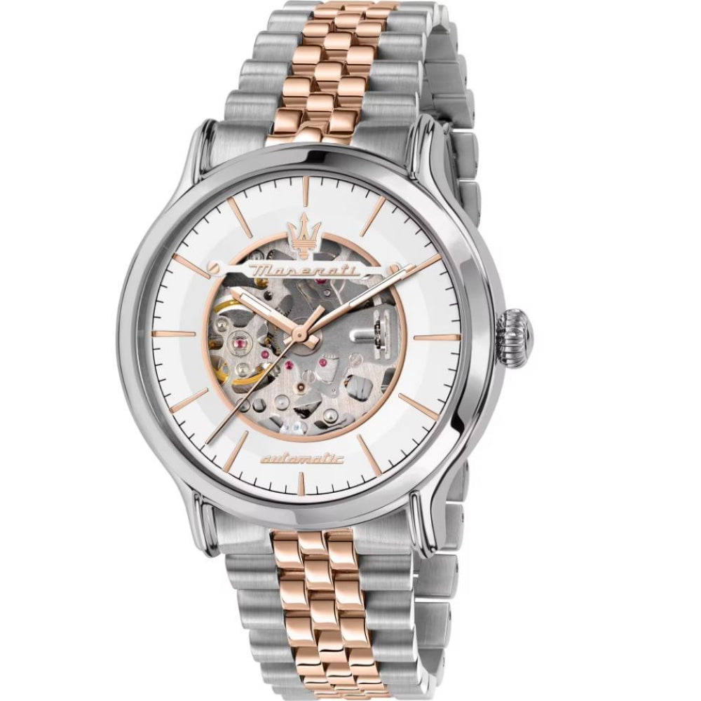 Maserati men's automatic watch from the Epoca collection. Round watch in silver and rose gold. It is in Asteel with rose gold PVD, has a case measuring 42mm and a water resistance rating of 10ATM.