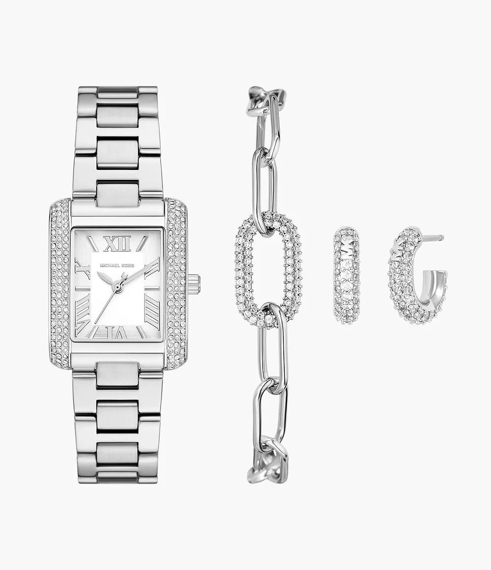 ● Model: MK4839SET Emery Three-Hand Silver-Toned Steel Watch, Bracelet & Earrings Gift Set