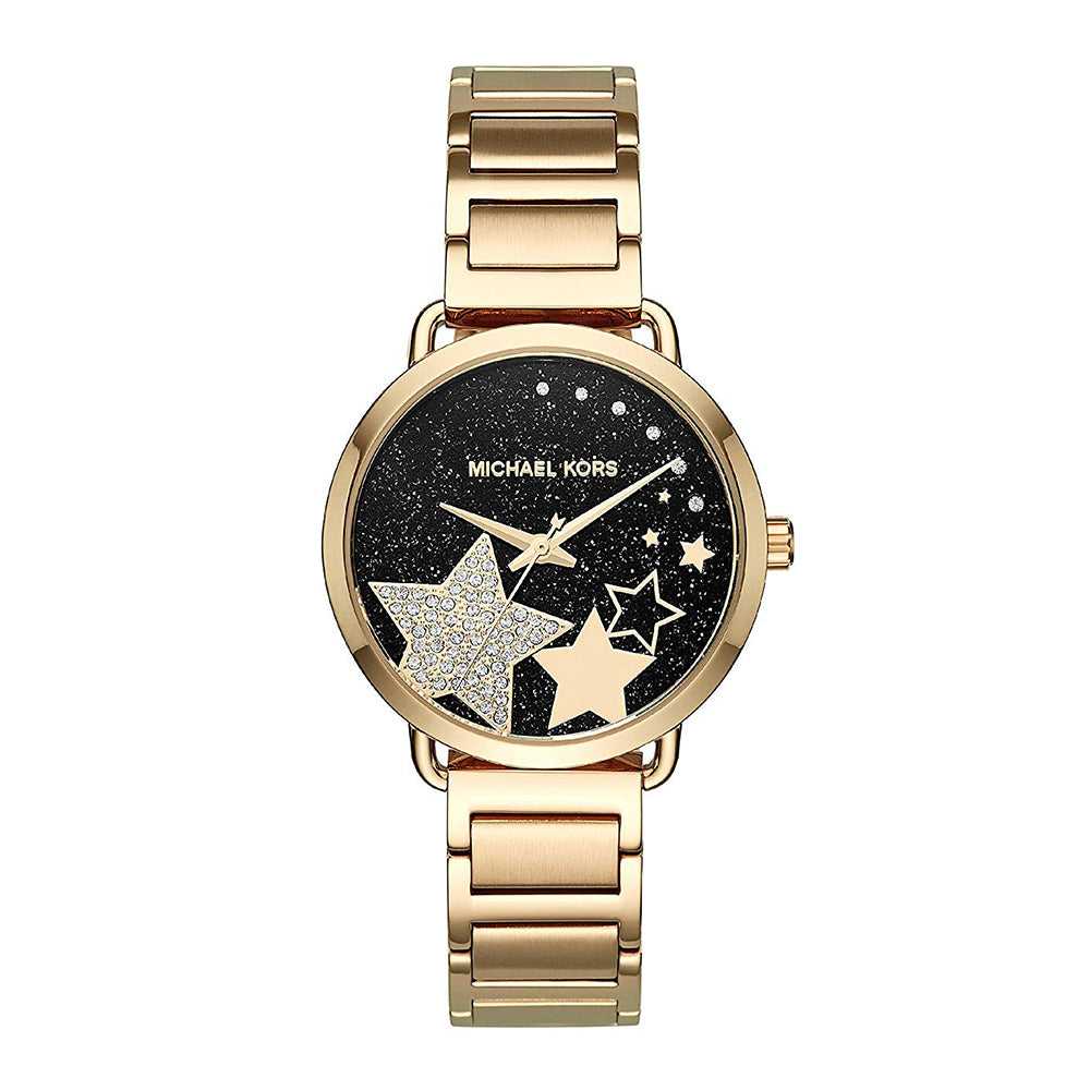 This Michael Kors Portia watch features a gold-tone case, a black dial with stars and pavé detail and is complete with a polished H-link bracelet.