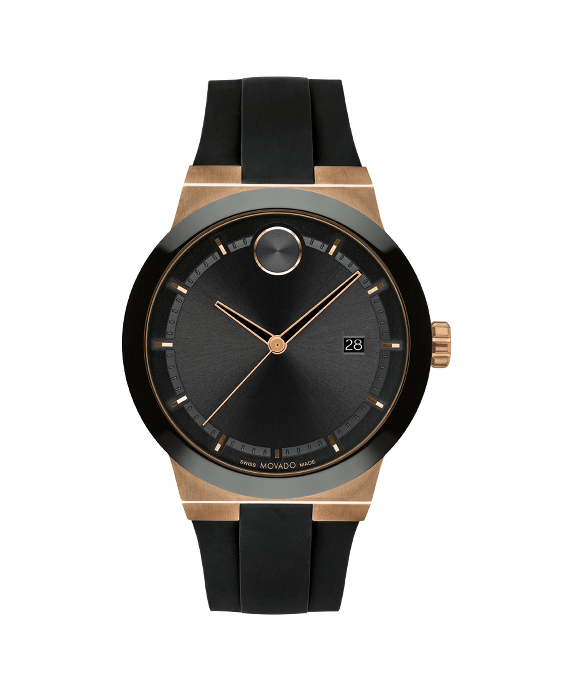 The Movado Bold Fusion is a true statement piece that combines modern design with timeless style. Featuring a 42mm bronze ion-plated stainless steel case and a black ceramic bezel, this watch exudes a bold and sleek look. The black-toned dial with applied markers ensures clear visibility, while the black silicone strap offers comfort and durability. Powered by Swiss quartz movement, this watch is a versatile addition to any collection, and its 5 ATM water resistance ensures it can withstand daily wear.