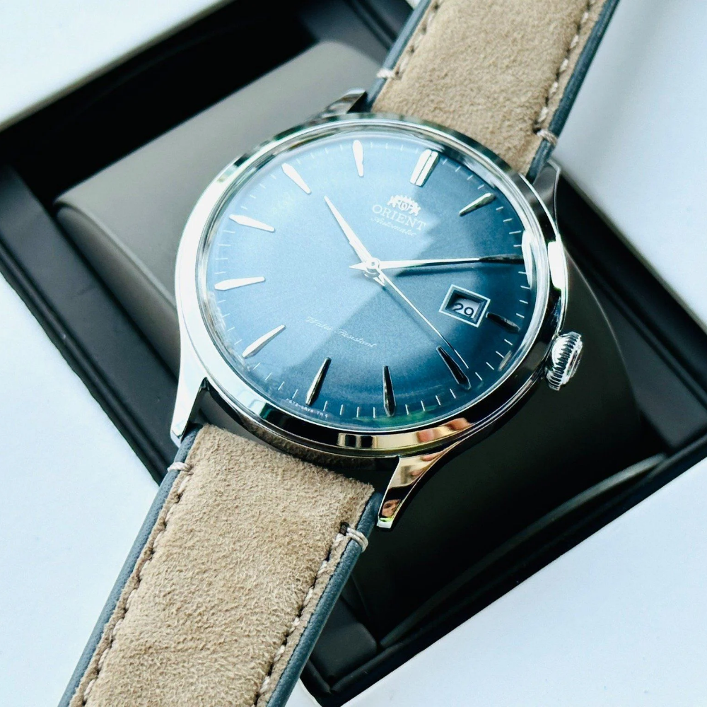 The Orient Bambino Automatic RA-AC0P03L10B men's watch will add a touch of class to your creations. The navy blue dial with silver-tone hands and indexes is decorated with a sunray cut and complemented by a day-of-the-month date stamp. The Orient F6724 Japanese automatic movement set on 22 jewels with a 40-hour power reserve is responsible for precise hour measurement. The model features a screw-down caseback. The water resistance is 3 ATM.