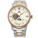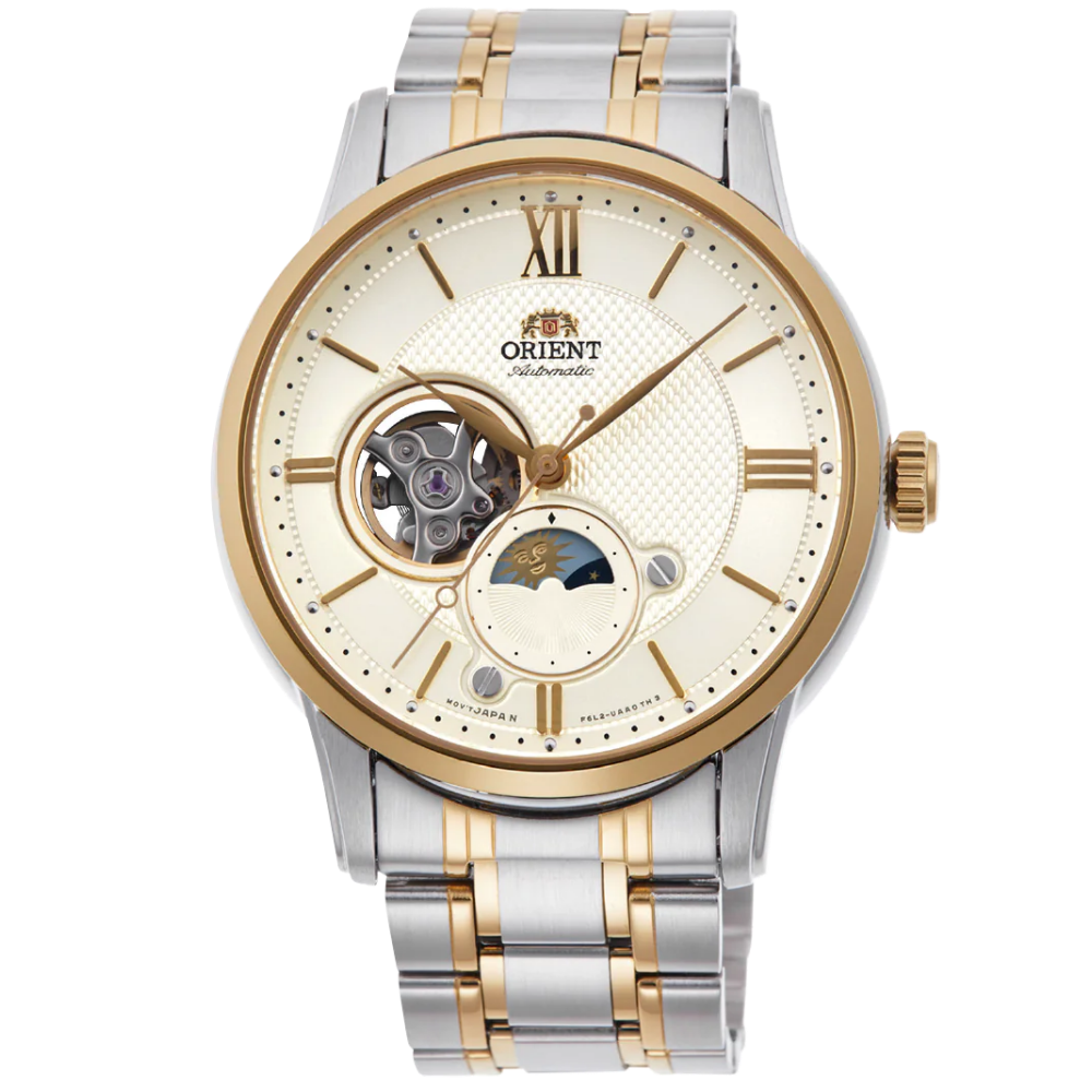 This stylish mechanical watch from our popular Semi Skeleton series showcases a combination of contemporary design with hints of classic style. This models feature a day and night display with sun and moon design showing the passing of time with a sun and moon disk that rotates once every 24-hours. The signature day and night display subdial at 6 o’clock and semi-skeleton view at 9 o’clock are set in a bold black dial, framed in a stainless steel case and curved sapphire crystal glass.