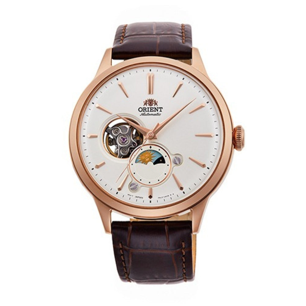 The Orient RA-AS0102S30B Bambino Sun & Moon is a classic timepiece that seamlessly combines vintage aesthetics with modern craftsmanship. Featuring a sun & moon complication, semi-skeleton dial, and an automatic movement, this watch is a perfect accessory for those who appreciate sophistication and elegance.