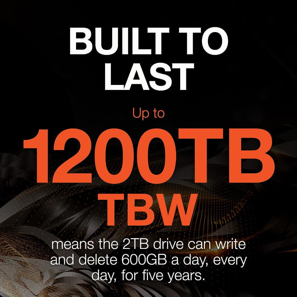 - BUILT TO LAST Up to 1200TB TBW means the 2TB drive can write and delete 600GB a day, every day, for five years.