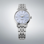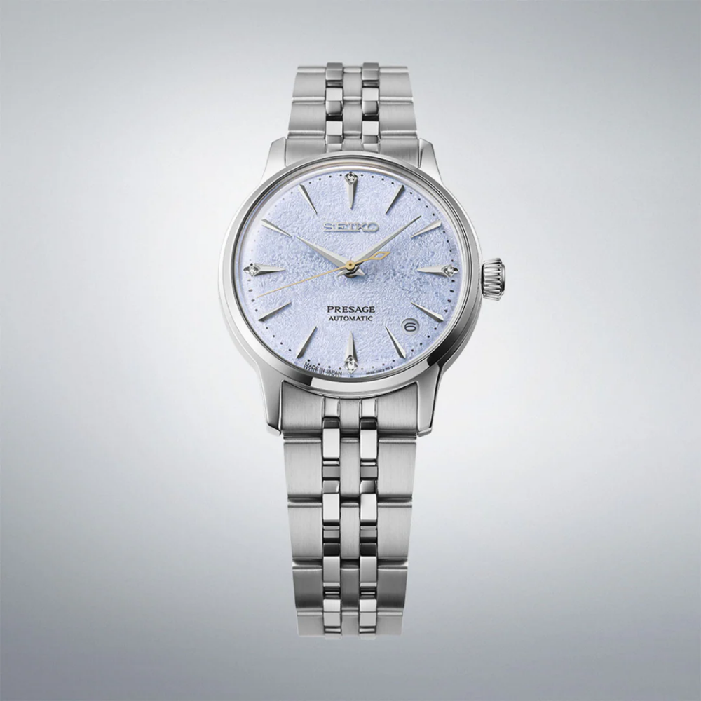 The Seiko Presage SRPL61J1 captures the charm of cocktail-inspired design in a refined 34mm case. Its light blue dial sparkles with four diamonds, housed under a box-shaped Hardlex crystal. Crafted in stainless steel, this automatic watch features the 4R35 movement with a 41-hour power reserve and see-through case back. A timeless blend of elegance and precision made for sophisticated everyday wear.
