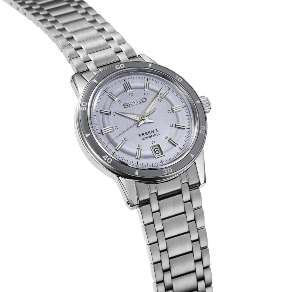 The classic Style 60s case design is inspired by the Seiko Crown Chronograph from 1964 – the first chronograph made in Japan, crafted especially for the Tokyo Olympics when Seiko first became official timekeepers. Accompanying the aluminium bezel is a silvery violet dial that features a raised circle effect for a futuristic style loved in the 1960s. The bracelet links are hairline finished for an elegant touch and to bring out the pastel colour of the dial.