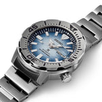 Seiko Prospex watch with 4R36 automatic movement, 41 hours charge reserve, 24 jewels, stainless steel case of 42.4 m/m diameter and 13.4 m/m thickness, 187gr weight, iced blue dial, day/date window at 3, indices and gray hands with Superluminova treatment, screw-down crown, screw-in case back, water resistant 20 BAR (200 meters), hardlex crystal, stainless steel bracelet.