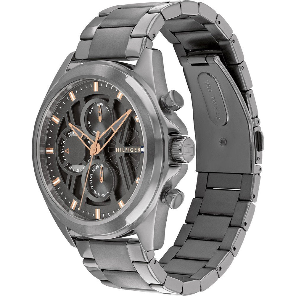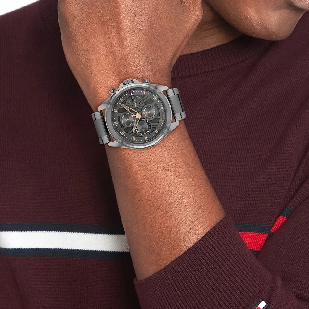 The Tommy Hilfiger 1710657 is a sophisticated and modern timepiece designed for men who appreciate timeless elegance with a contemporary twist. Featuring a sleek stainless steel case and bracelet, the watch is finished in a stylish gray tone, complemented by rose gold-tone hands for a refined contrast.