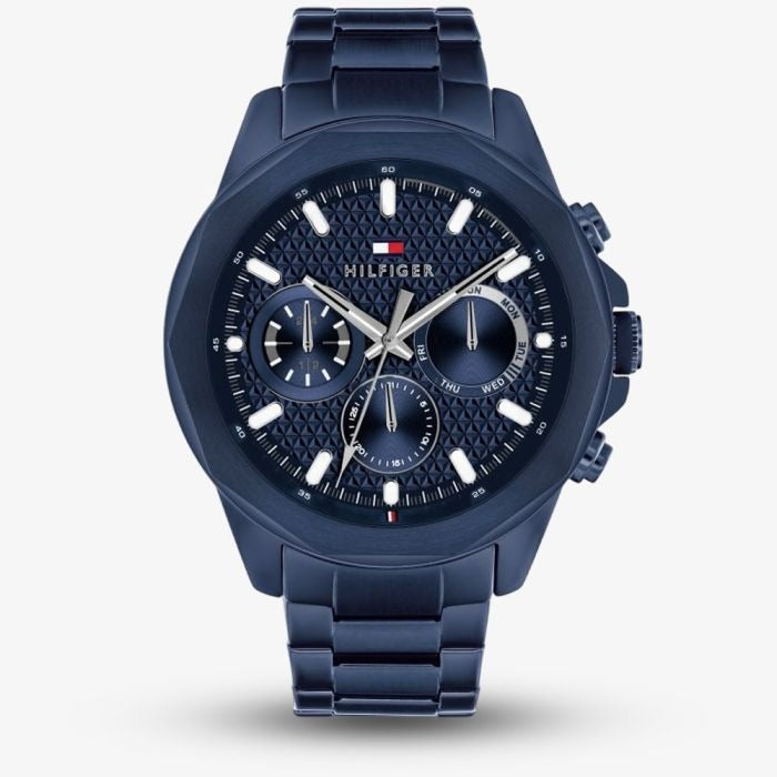 The Tommy Hilfiger Lars 1710652 blends bold design with everyday functionality, featuring a textured blue dial that enhances its modern and sophisticated appeal. The 46mm PVD-plated case ensures durability, while the glowing hands and markers provide excellent visibility in low-light conditions.