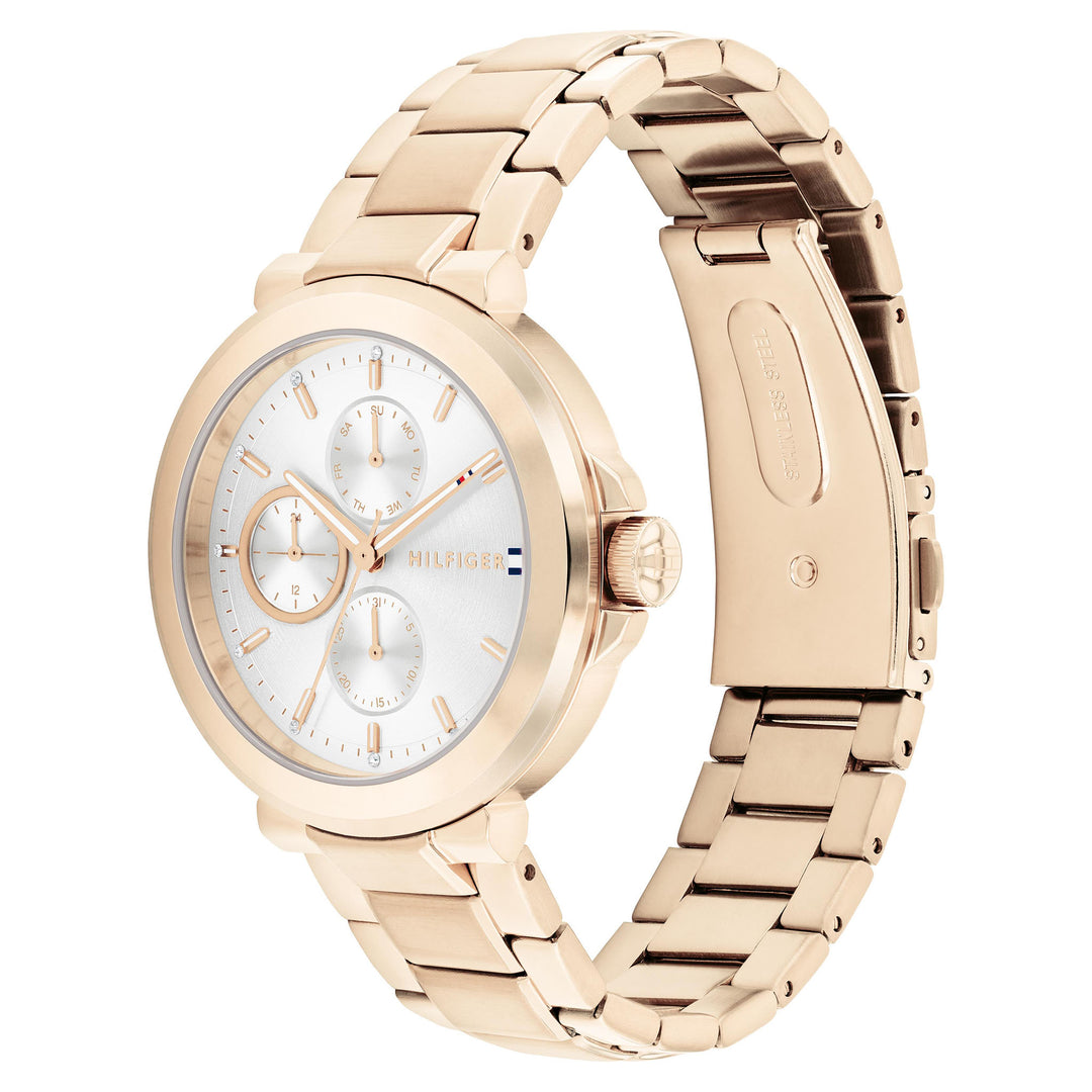 The Tommy Hilfiger Lori Carnation Gold Plated Steel Watch 1782756 is an elegant and versatile timepiece designed for women who appreciate both style and functionality. Featuring a 38mm ionic carnation gold-plated stainless steel case and a silver white dial, this watch exudes a refined yet modern appeal.