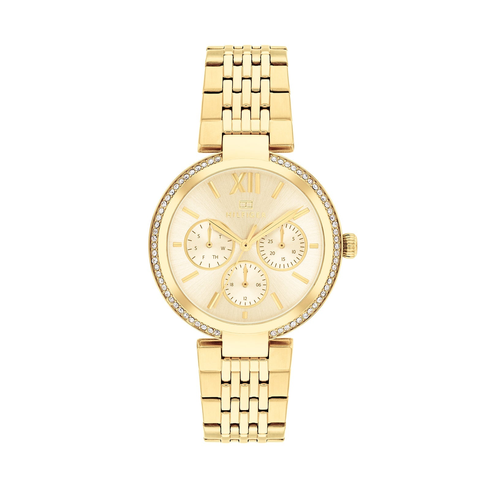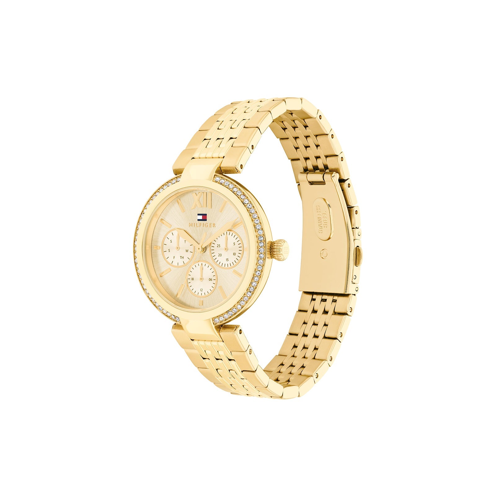 The Tommy Hilfiger Sophia 1782697 is an elegant and timeless women's watch, crafted with an ionic thin gold-plated stainless steel case and bracelet for a luxurious finish. The sleek gold-tone dial adds a touch of sophistication, making it a versatile accessory that can be worn for both casual and formal occasions.