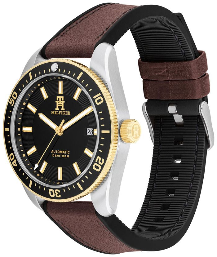TOMMY HILFIGER TH85 AUTOMATIC BLACK DIAL BROWN LEATHER STRAP WATCH 1792142