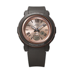 This BABY-G delivers the ruggedness you expect in a lightweight, slim design and a simple round case and wide face to ensure an easy read. Features Roman indexes for a touch of elegance and a vapor deposition finish in pink gold on the hands, indexes, and bezel ring for a beautifully smooth metallic polish.