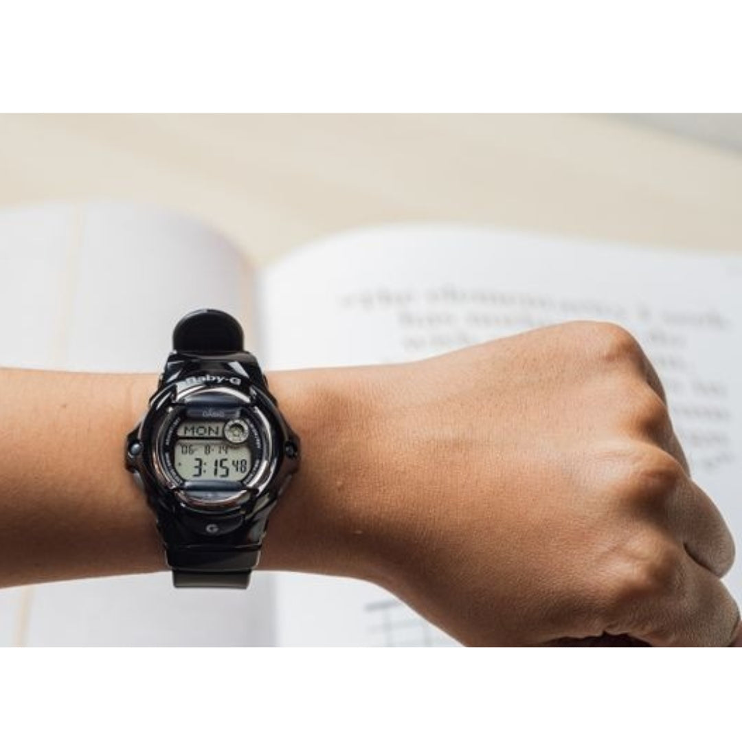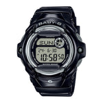 From BABY-G, the casual watch for active women, comes a collection of new models designed to accent summertime fashions. This new digital display lineup features black colouring. The base model is the popular petite BG169 with face protectors with a metallic bezel ring that adds a sparkling touch of elegance. This watch features a resin band, mineral glass face, shock resistance, 200m water resistance, electro-luminescent backlight with afterglow, data bank memory capacity up to 25 sets of data, world time (29 time zones), day counter, 1/100 second stopwatch, countdown timer, 5 daily alarms, full auto calendar (up to 2099), 12/24 hour formats, button operation tone on/off, approx. battery life: 3 years on CR1616