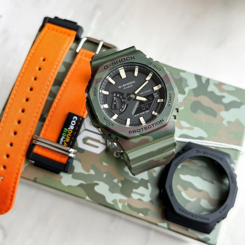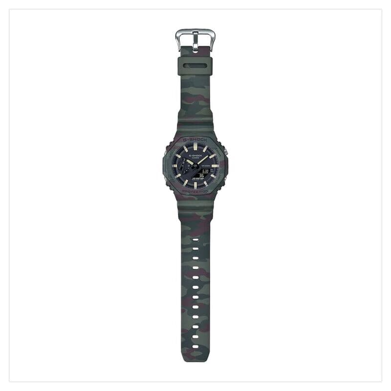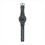 Obtain this men's analog-digital watch from the G-Shock Carbon Core Guard collection by Casio to exalt your style. Its round-shaped black dial bears a chronograph quartz movement to keep you on time. The resin strap of this watch exudes a green hue for an eye-catching look. It has been intricately constructed for durable usage. The 200 m water resistance and shock resistance features add to its durability.