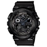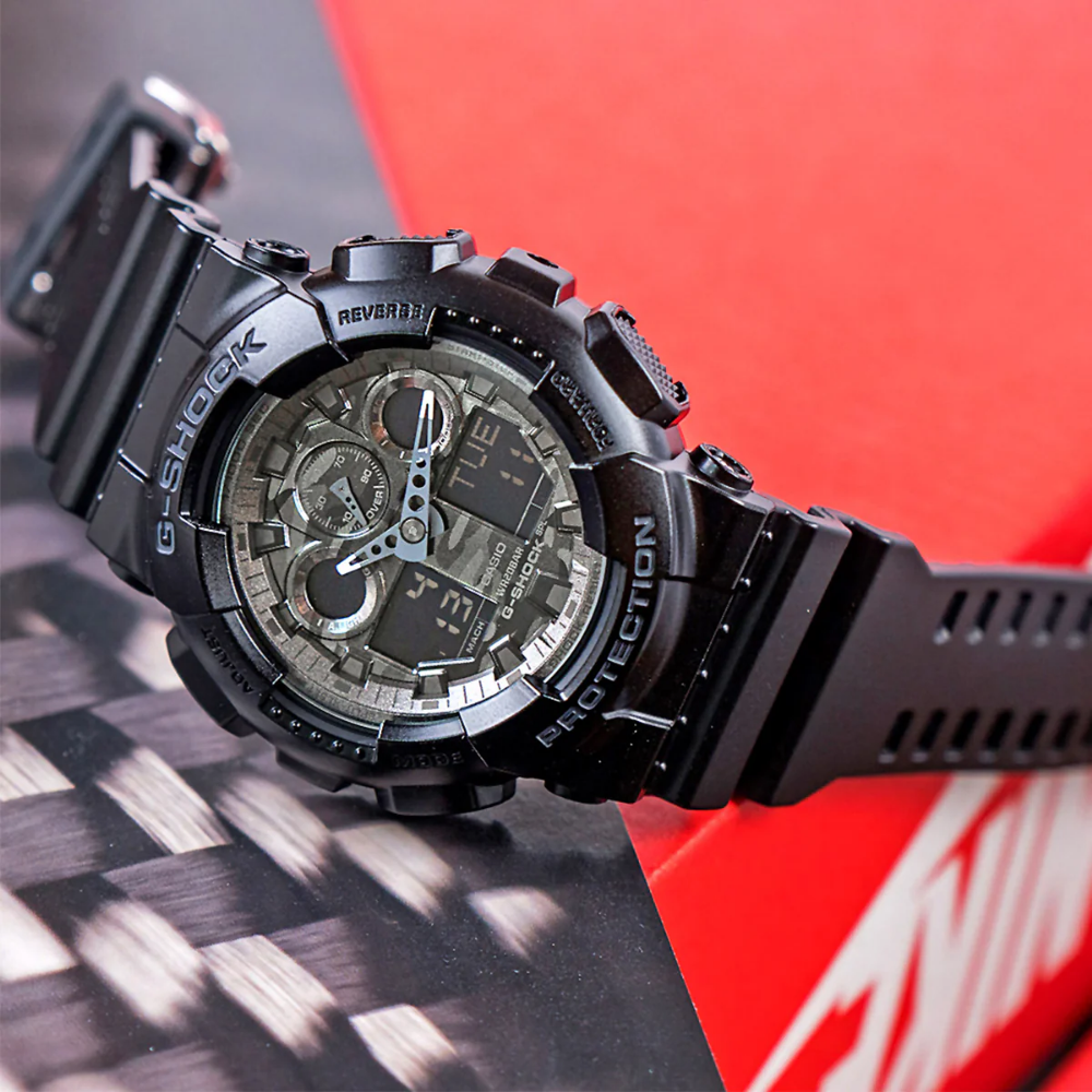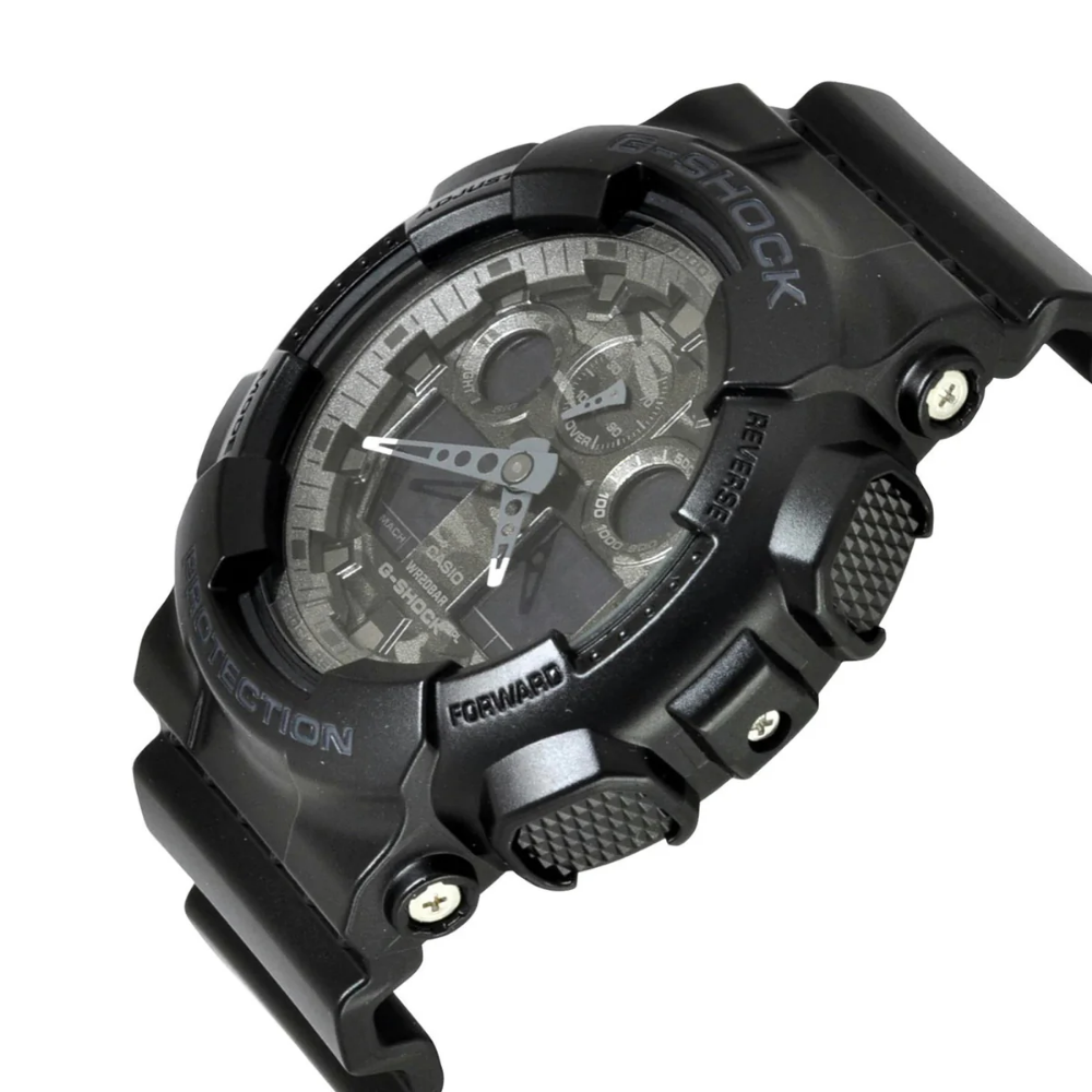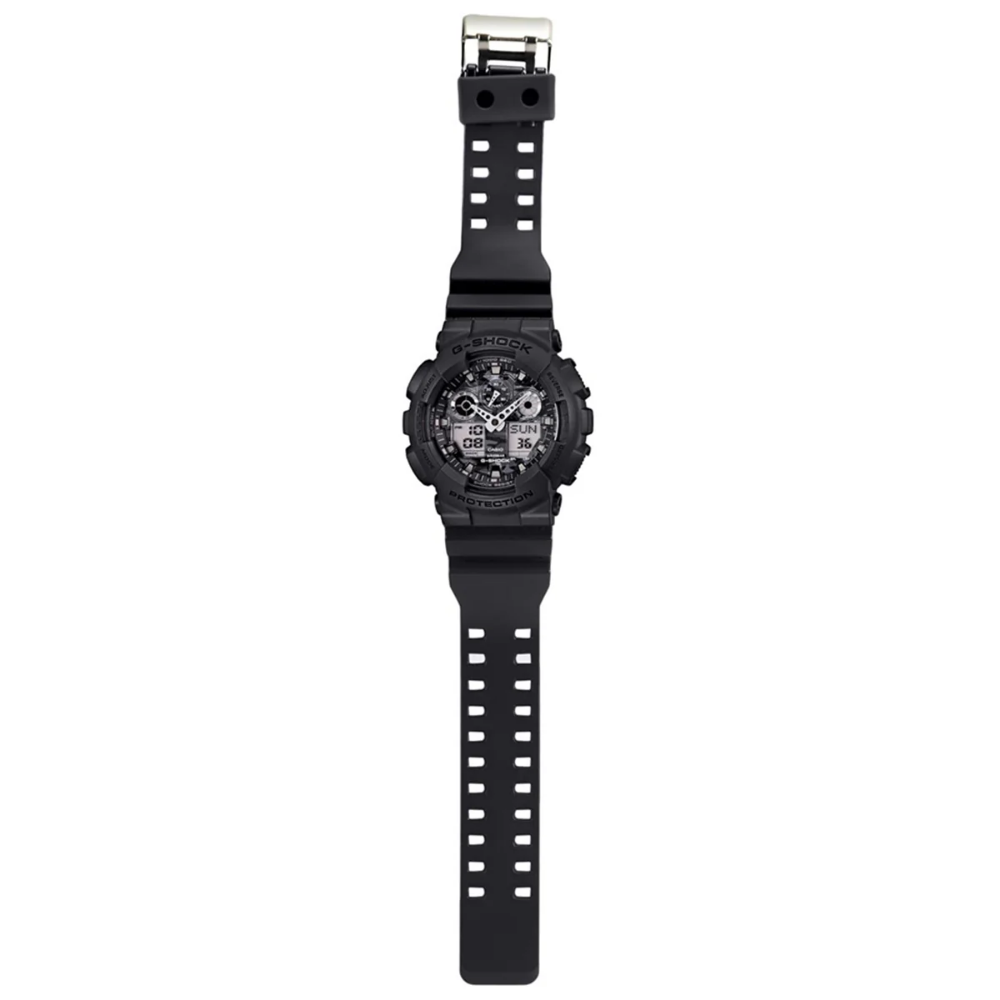 From the popular big, bold GA-100 Series comes a new collection of models that feature a camouflage pattern face. Basic black or gray coloring is offset by the metallic camouflage pattern of the face, which is further accented by the silver or gold coloring of the hands and hour markers.