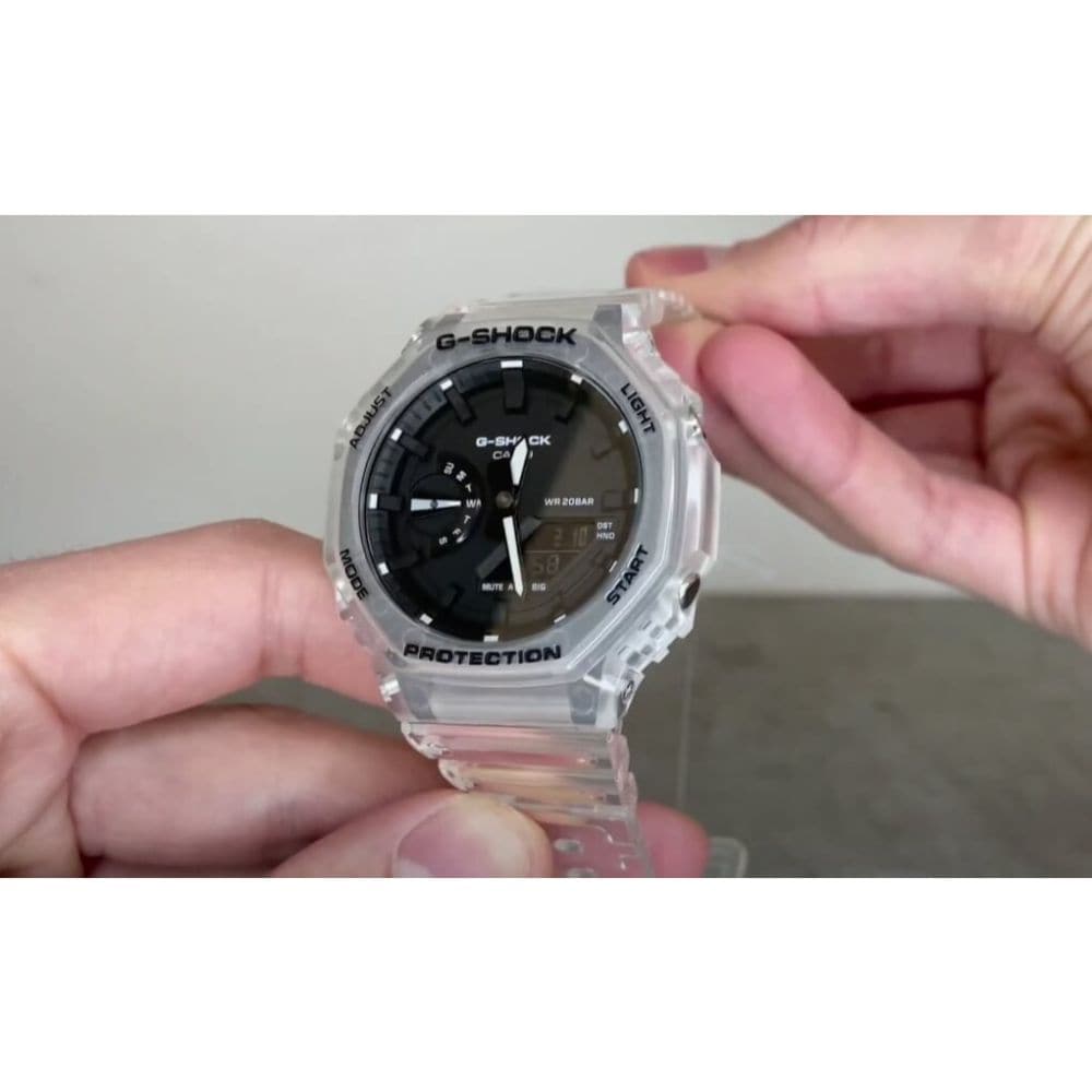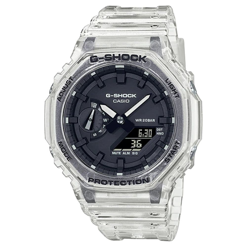From G-SHOCK, the toughness watches that are ever evolving in an endless pursuit of strength, the skeleton series models are made from translucent resin parts. The coloring is clear with a white base. Based on the popular GA-2100 with its carbon core guard structure and octagonal bezel, this skeleton series model features chic coloring, making it suitable as a fashion item.