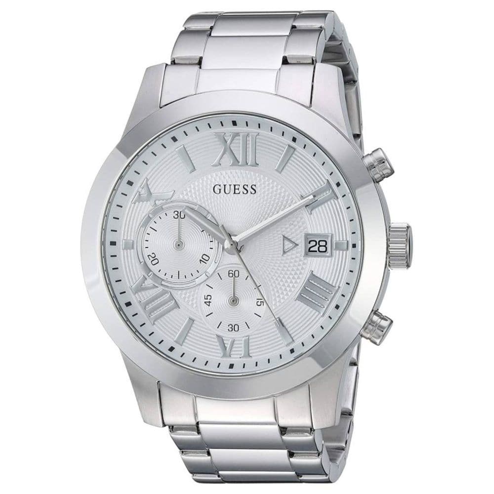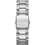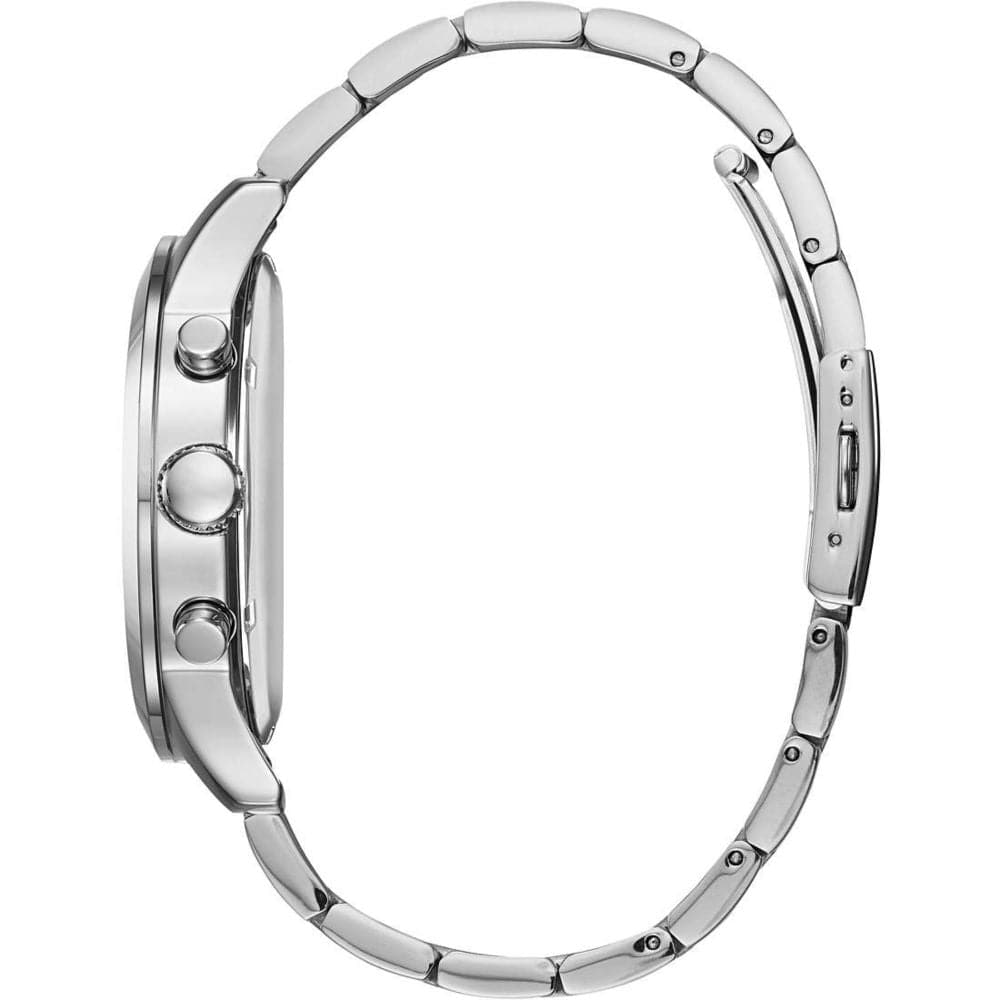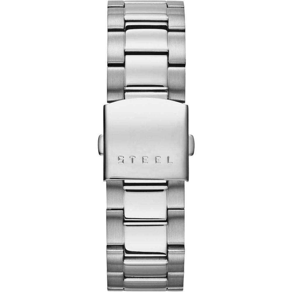 Stainless steel case with a stainless steel bracelet. Fixed stainless steel bezel. Silver dial with luminous silver-tone hands and alternating Roman numeral and index hour markers. Minute markers around the outer rim.