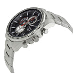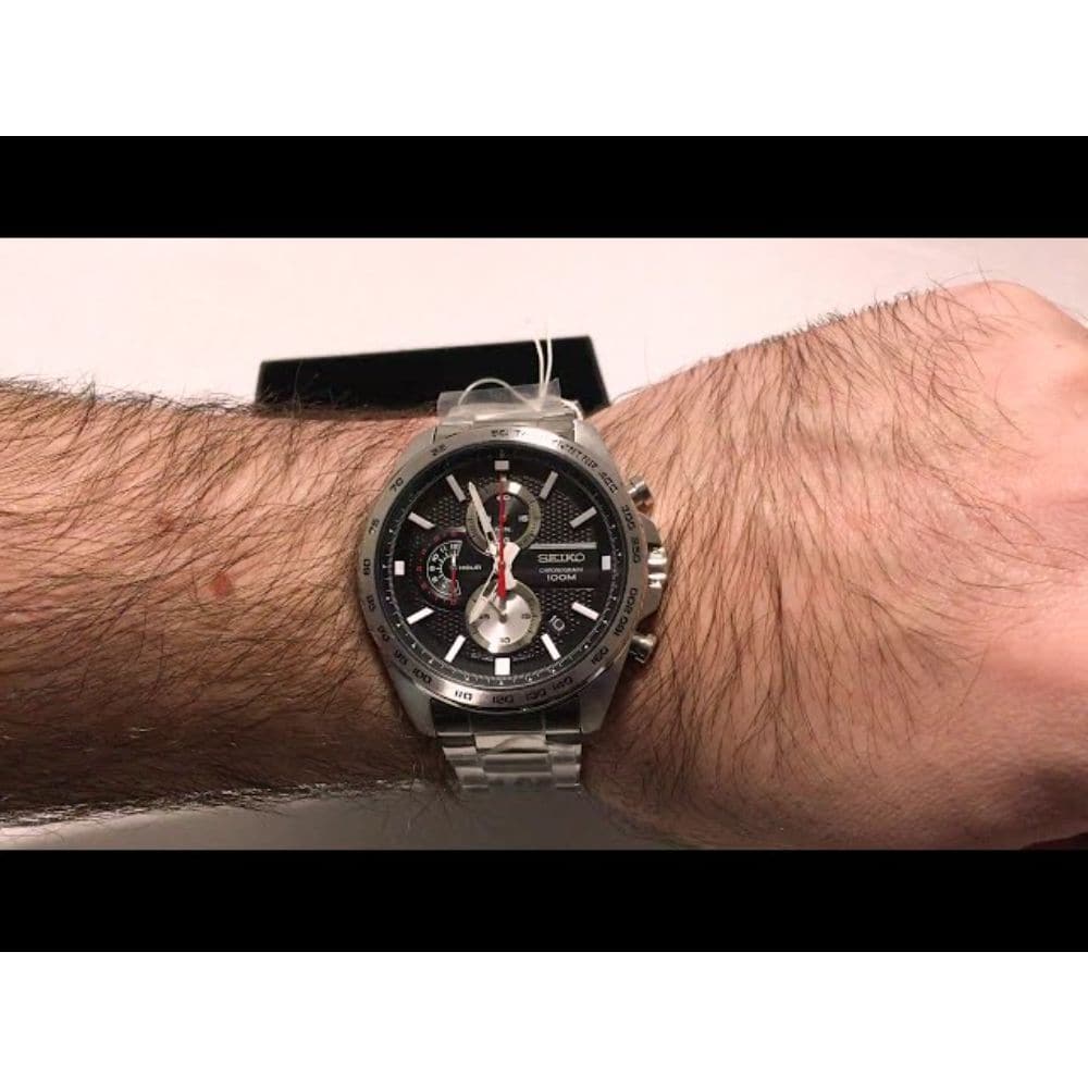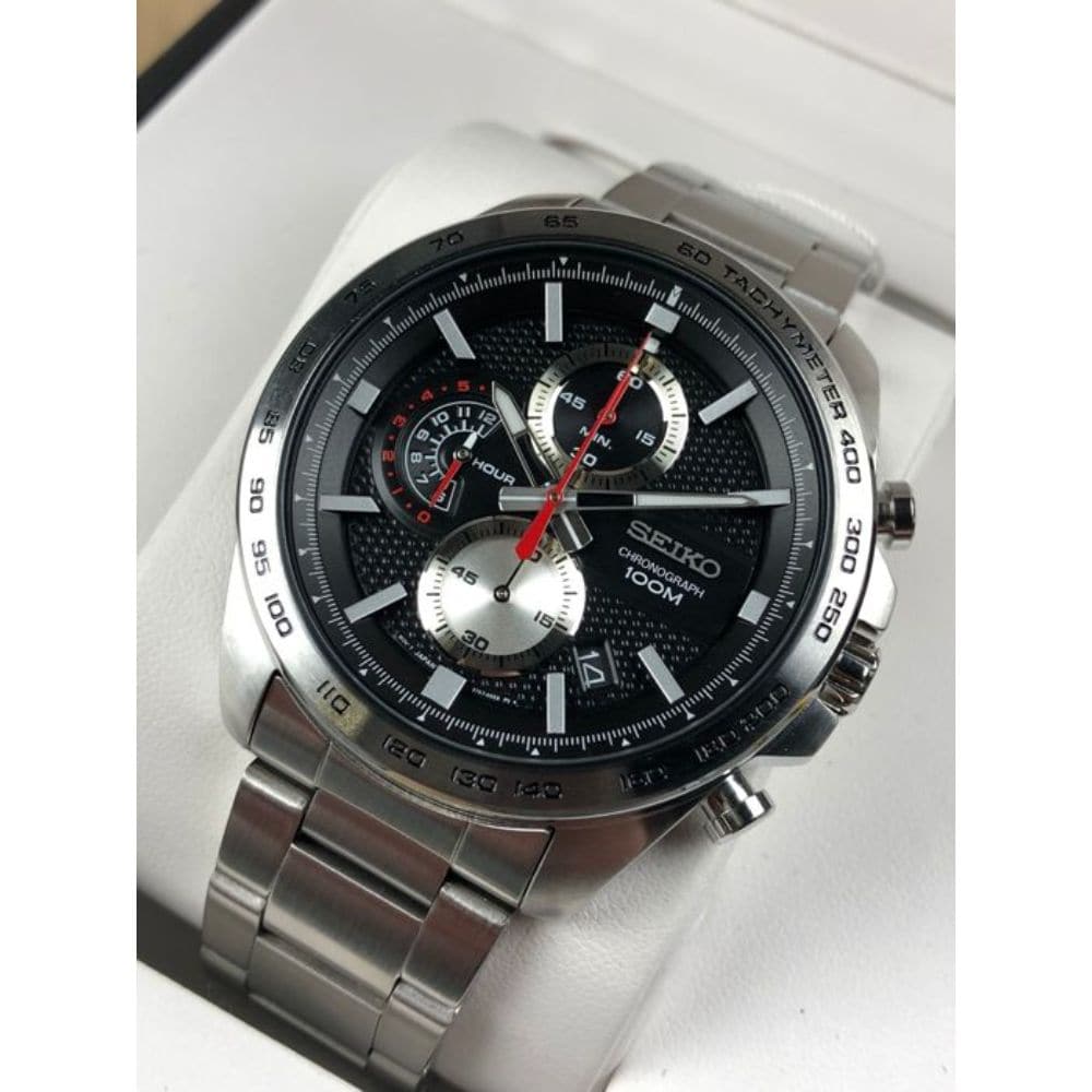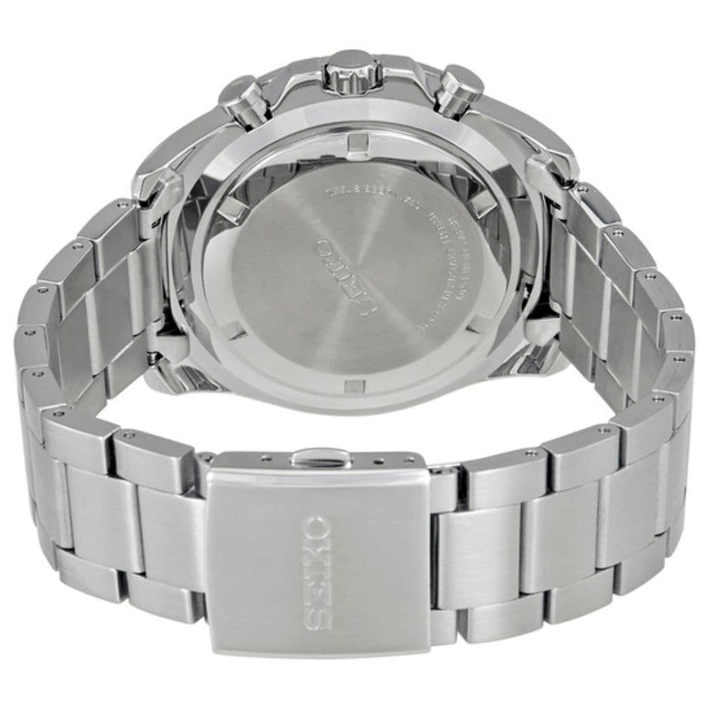 Silver-tone stainless steel case and bracelet. Fixed silver-tone stainless steel showing tachymeter markings bezel. Black dial with luminous silver-tone hands and index hour markers. Minute markers around the outer rim. Dial Type: Analog. Luminescent hands. Date display between the 4 and 5 o'clock positions. Chronograph - three sub-dials displaying: 60 second, 60 minute and 12 hour. Seiko caliber 8T67 quartz movement. Scratch resistant Hardlex crystal. Solid case back. Round case shape. Case size: 44 mm. Case thickness: 12 mm. Band width: 22 mm. Fold over clasp with a safety release. Water resistant at 100 meters / 330 feet. Functions: chronograph, date, hour, minute, second. Sport watch style. Watch label: Japan Movt. Seiko Chronograph Quartz Black Dial Men's Watch SSB255P1.