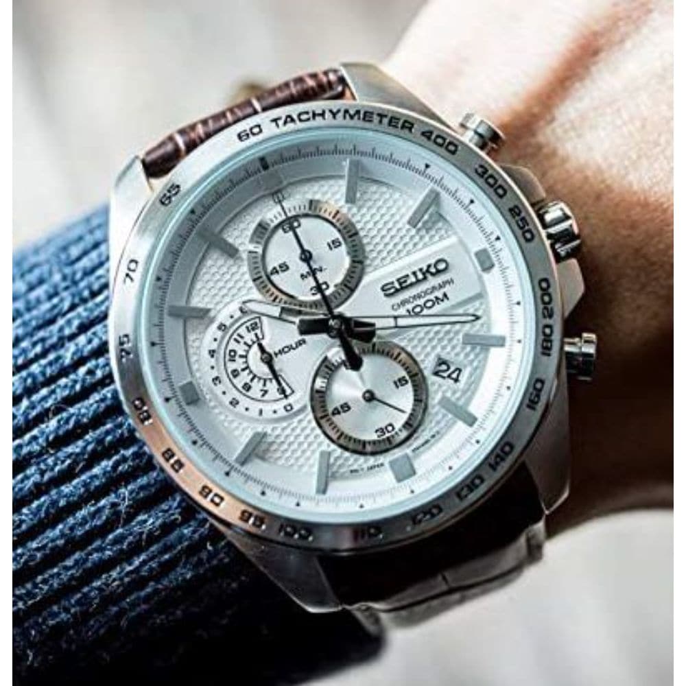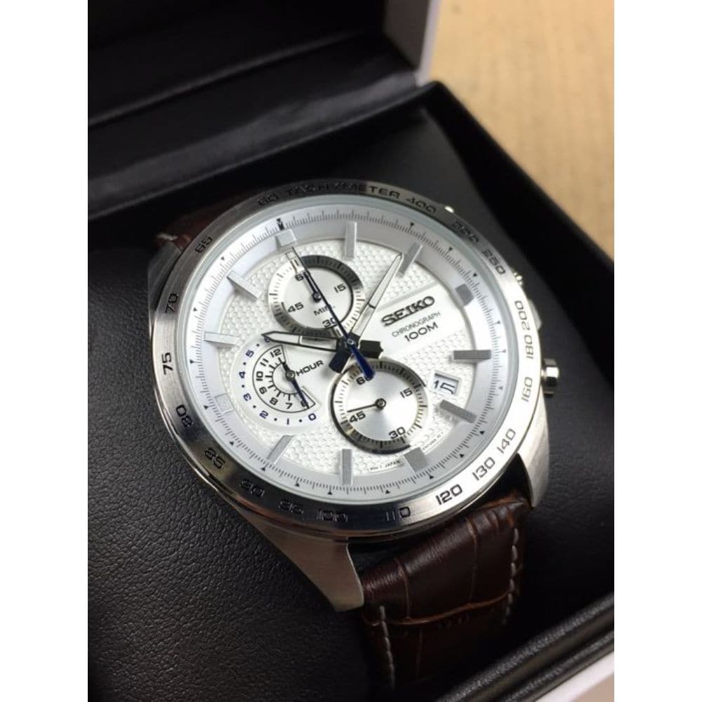 Stainless steel case with a brown leather strap. Fixed stainless steel bezel showing tachymeter markings. White dial with luminous silver-tone hands and index hour markers. Minute markers around the outer rim. Dial Type: Analog. Luminescent hands and markers. Date display between the 4 and 5 o'clock positions. Chronograph - three sub-dials displaying: 60 second, 30 minute and 12 hours. Seiko caliber 8T67 quartz movement. Scratch resistant Hardlex crystal. Solid case back. Round case shape. Case size: 44 mm. Case thickness: 12 mm. Band width: 22 mm. Tang clasp. Water resistant at 100 meters / 330 feet. Functions: chronograph, tachymeter, date, hour, minute, second. Additional Info: suitable for snorkeling as well as swimming but not diving. Sport watch style. Seiko Chronograph White Dial Brown Leather Men's Watch SSB263P1.
