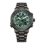 Take your adventures to new heights with the Promaster Sky Pilot, a professional-grade addition to Citizen’s Promaster collection. Built for both performance and endurance, its 41mm stainless steel case is paired with a robust triple-link bracelet and dual crowns, ensuring a bold yet functional design. With water resistance up to 200 meters, this flight-ready companion is prepared for every mission. The aviation-inspired dial delivers sharp legibility, featuring luminous hands and markers against a sleek green background. A rotating slide-rule bezel, operated via the 7 o’clock crown, offers advanced pilot functions, while a 3 o’clock date window adds everyday practicality. Inside, cutting-edge functionality includes world time across 26 time zones, a perpetual calendar, 12/24-hour display, and a power reserve indicator. Powered by Citizen’s light-driven Eco-Drive Atomic Timekeeping technology, the Sky Pilot automatically syncs to local signals across four regions, keeping perfect time wherever your journey takes you—no matter the skies.