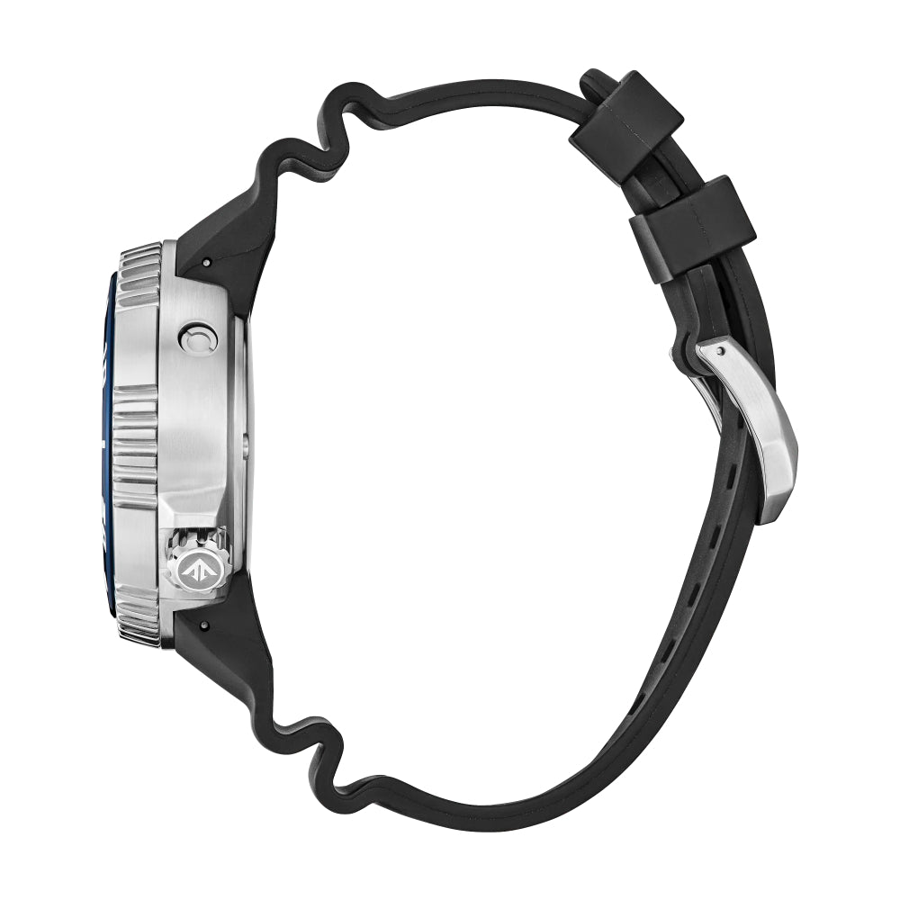 This new limited-edition model comes as part of the dive-ready Promaster collection, marking a unique take on the professional-grade style and performance. The robust 46mm silver-tone stainless steel exterior ensures up to 300 meters of water resistance, making use of a 4 o'clock screw-down crown placement and an easy-grip bezel executed in black for an incredibly bold aesthetic. Hidden lugs connect to a strap made from BENEBiOL™ PU, which includes plant-based materials, securing the timepiece to the wrist. The highly legible dial is brought to life through pigment-free ink that uses light – the same light that powers the Eco-Drive technology within – to reflect off the surface of the ink microstructures and create an array of aquatic shades. Functions include time, date, and with a movement requiring exposure to adequate light to then run for 365 days on a full charge, without ever needing a battery. Caliber E365.