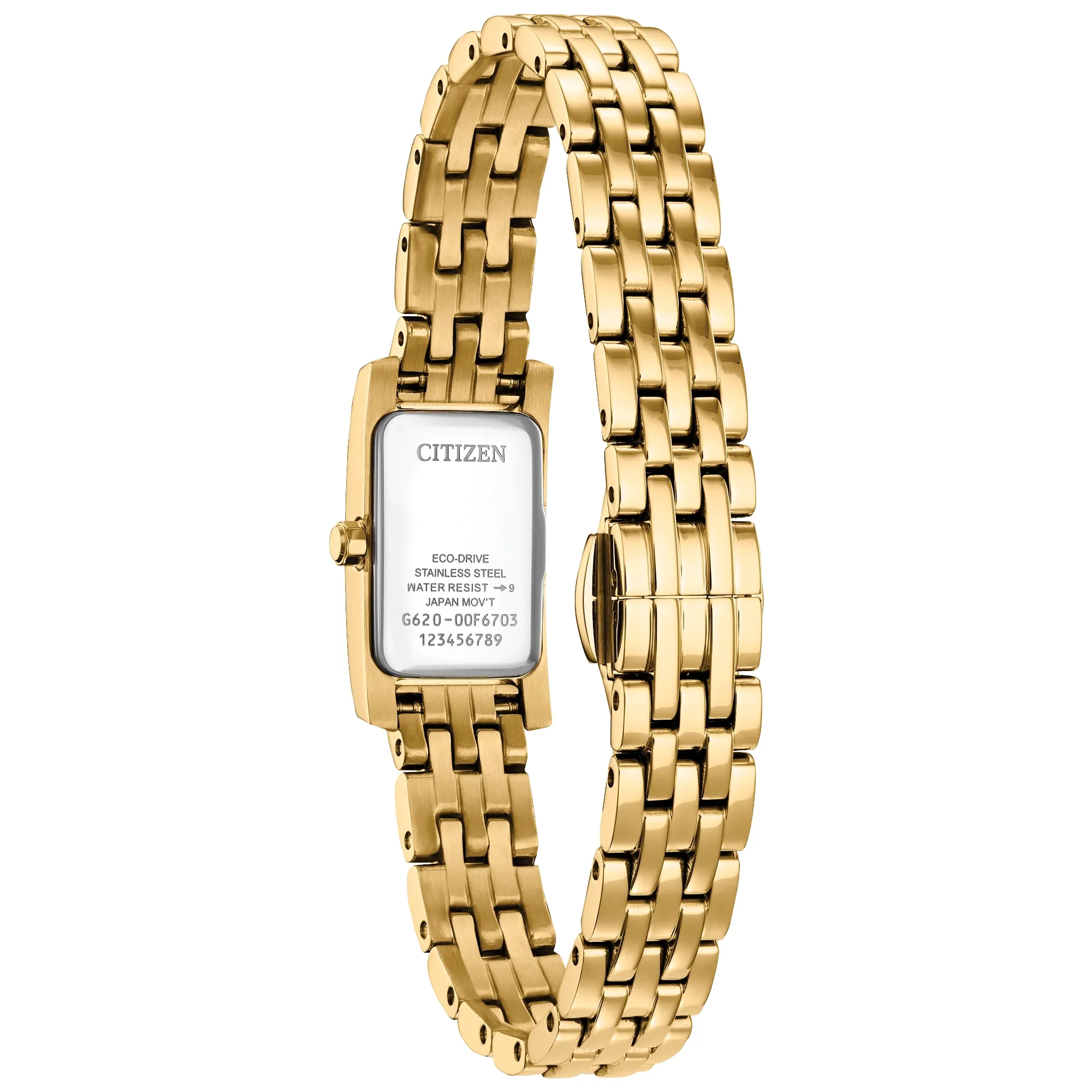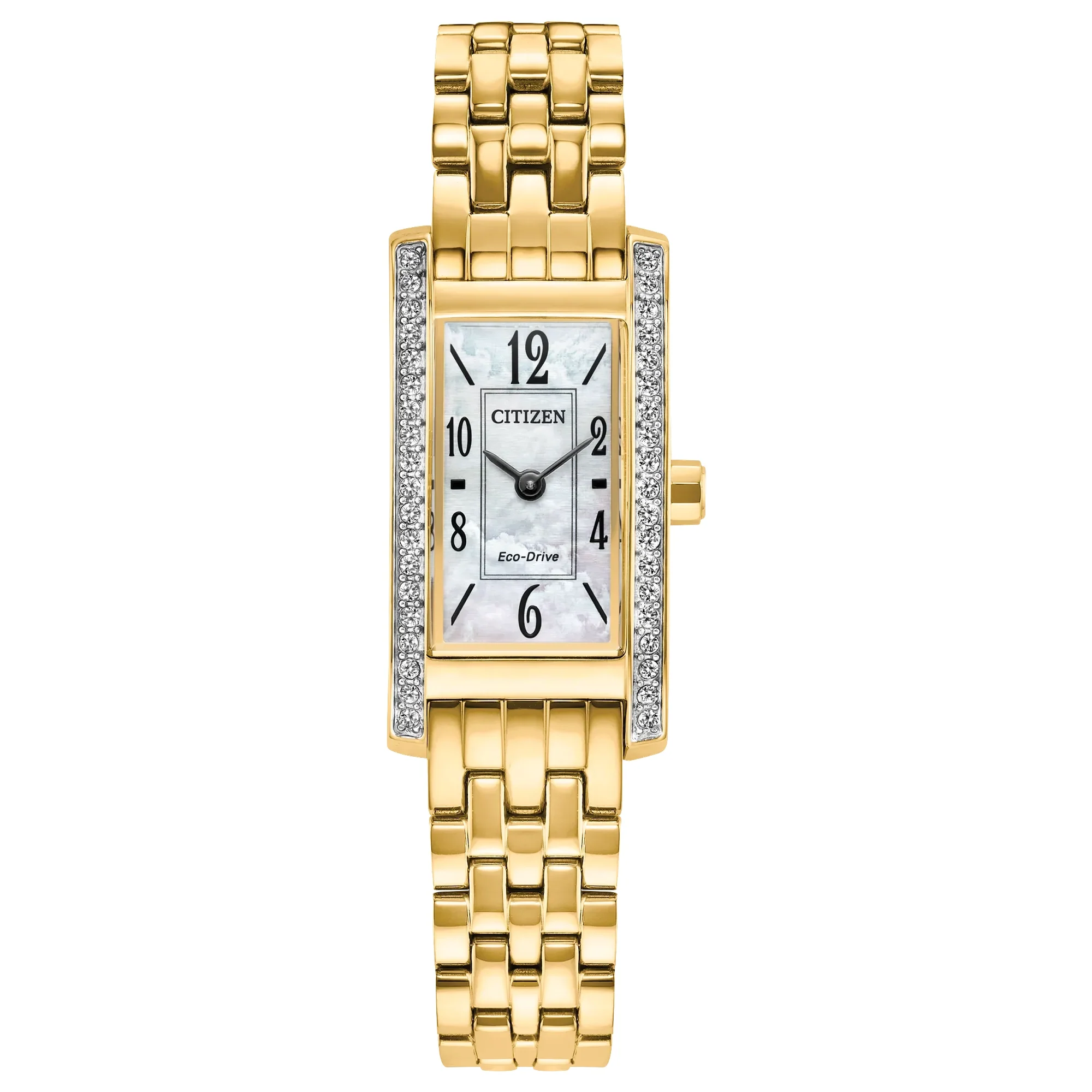 The white mother-of-pearl dial is as much an exercise in sophisticated art deco as the case, with stylized indices in black being framed in creative fashion while shortened hour and minute hands indicate the time. Sustainably powered by any light with our proprietary Eco-Drive technology that never needs a battery, this elegant ladies’ watch is the perfect addition to any look.
