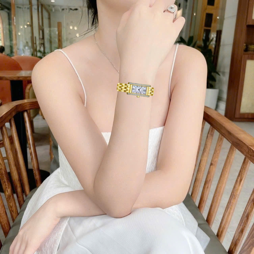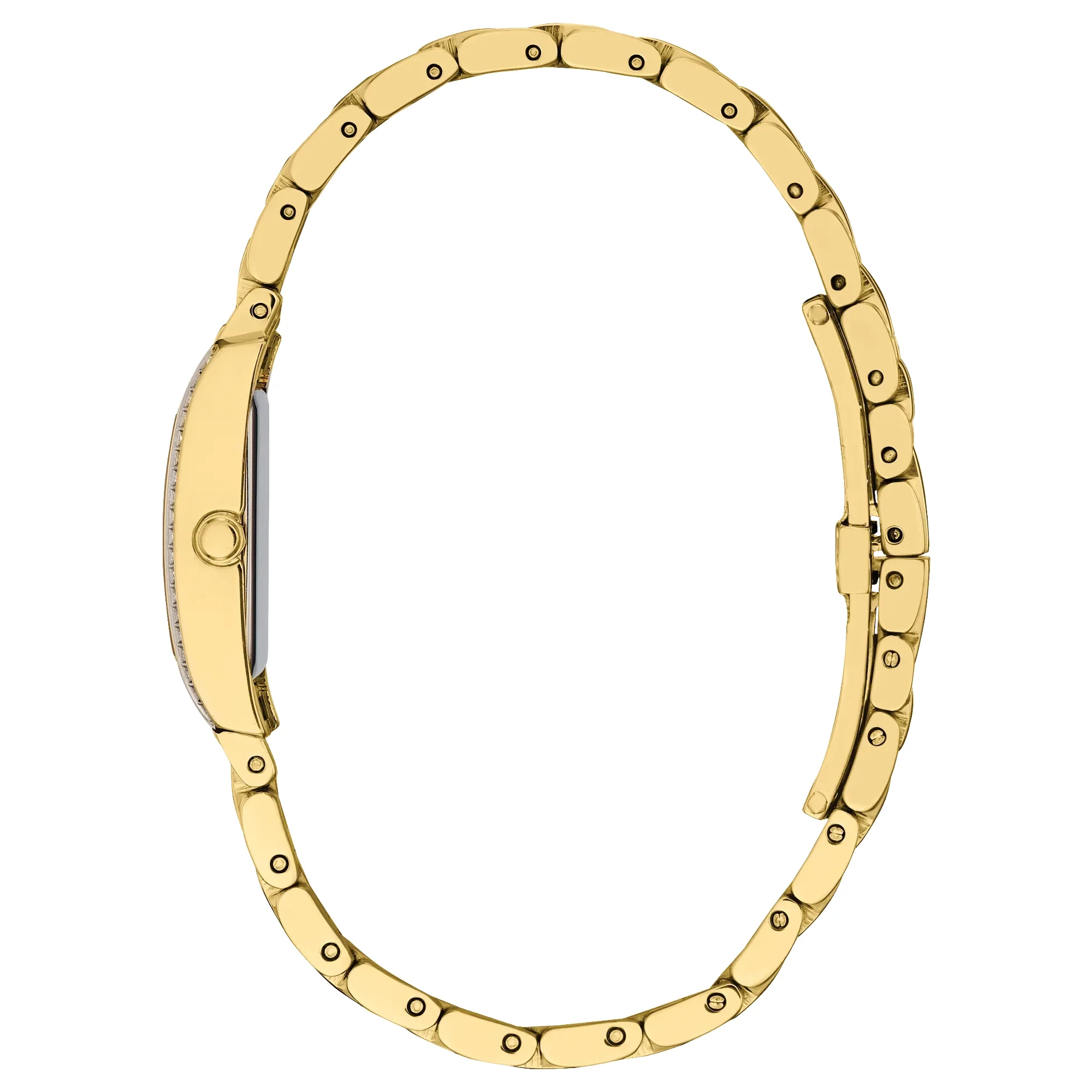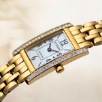 Inspired by the elegant, elongated shape of the original, the Petite Palidoro reissue is the latest women’s watch in our Dress Classic collection and is the perfect complement for elegant wear. On the wrist, the timepiece measures 28mm in gold-tone stainless steel, with its rectangular form accented by crystals on either side of the bezel and a lovely geometric crown. A matching five-link bracelet effortlessly secures the watch to the wrist.