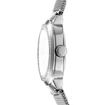 A watch that exudes modern elegance with its crystal-adorned bezel, minimalist silver dial, and refined mesh bracelet. A perfect blend of sophistication and contemporary style, this timepiece is designed for those who shine with effortless grace.
