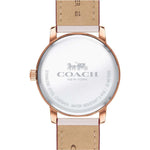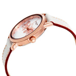 Rose gold-tone stainless steel case with a white leather strap. Fixed rose gold-tone bezel. White (horse and carriage) dial with grey hands and dot hour markers. Dial Type: Analog. Quartz movement. Scratch resistant mineral crystal. Pull / push crown. Solid case back. Round case shape. Case size: 36 mm. Case thickness: 8 mm. Band width: 18 mm. Tang clasp. Water resistant at 30 meters / 100 feet. Functions: hour, minute, second. Dress watch style.