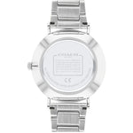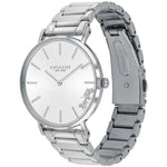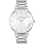Stainless steel case with a stainless steel bracelet. Fixed stainless steel bezel. Silver dial with silver-tone hands and index hour markers. Dial Type: Analog. Quartz movement. Scratch resistant mineral crystal. Pull / push crown. Solid case back. Round case shape. Case size: 36 mm. Case thickness: 7.5 mm. Band width: 18 mm. Fold over clasp with a push button release. Water resistant at 30 meters / 100 feet. Functions: hour, minute. Casual watch style.