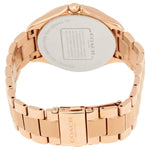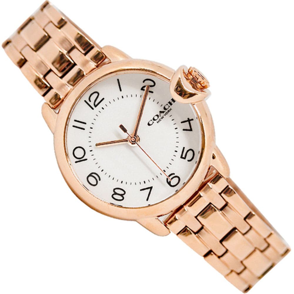 Rose gold-tone stainless steel case and bracelet. Fixed rose gold-tone bezel. White dial with rose gold-tone hands and Arabic numeral hour markers. Minute markers around an inner ring. Dial Type: Analog. Quartz movement. Scratch resistant mineral crystal. Pull / push crown. Solid case back. Round case shape. Case size: 28 mm. Case thickness: 8.5 mm. Band width: 13 mm. Fold over clasp with a push button release. Water resistant at 30 meters / 100 feet. Functions: hour, minute, second. Arden Series. Casual watch style.