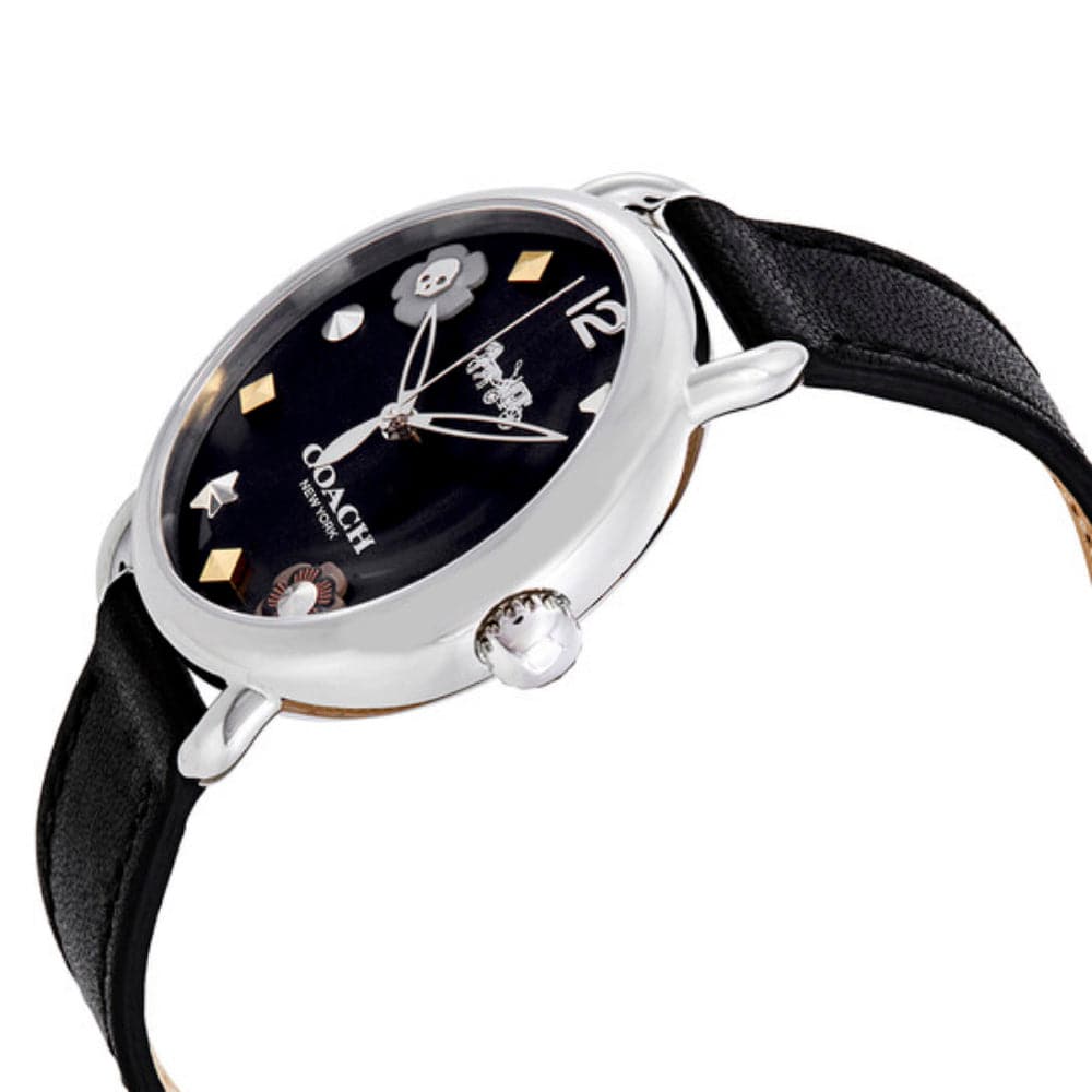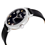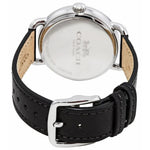 This beautiful timepiece has a silver stainless steel case and a black genuine leather strap. It's powered by quartz movement.