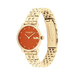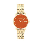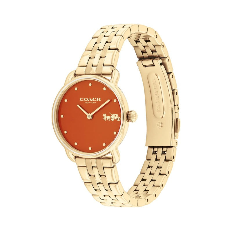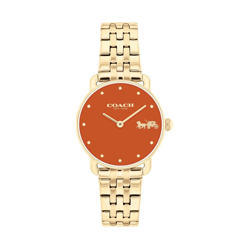 The Coach Elliot Horse & Carriage Watch combines timeless elegance with modern sophistication. Featuring a striking red dial and gold-tone bracelet, this timepiece is detailed with dome markers and the iconic Coach Horse and Carriage motif, making it a perfect statement accessory for any occasion.